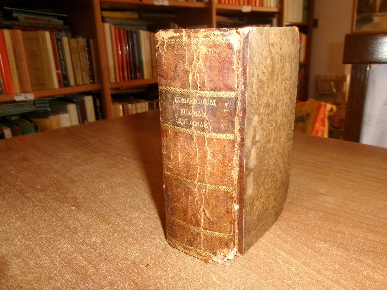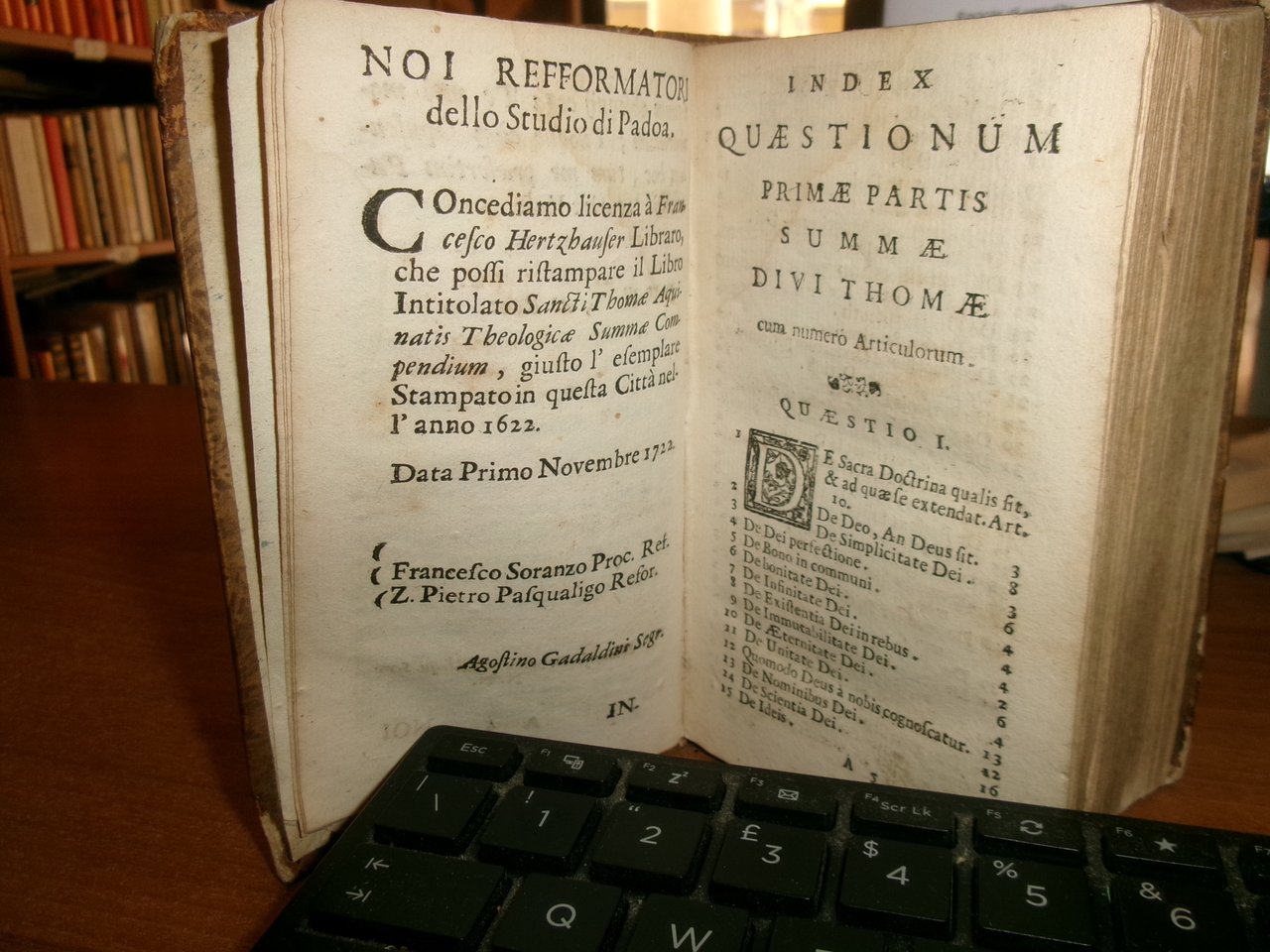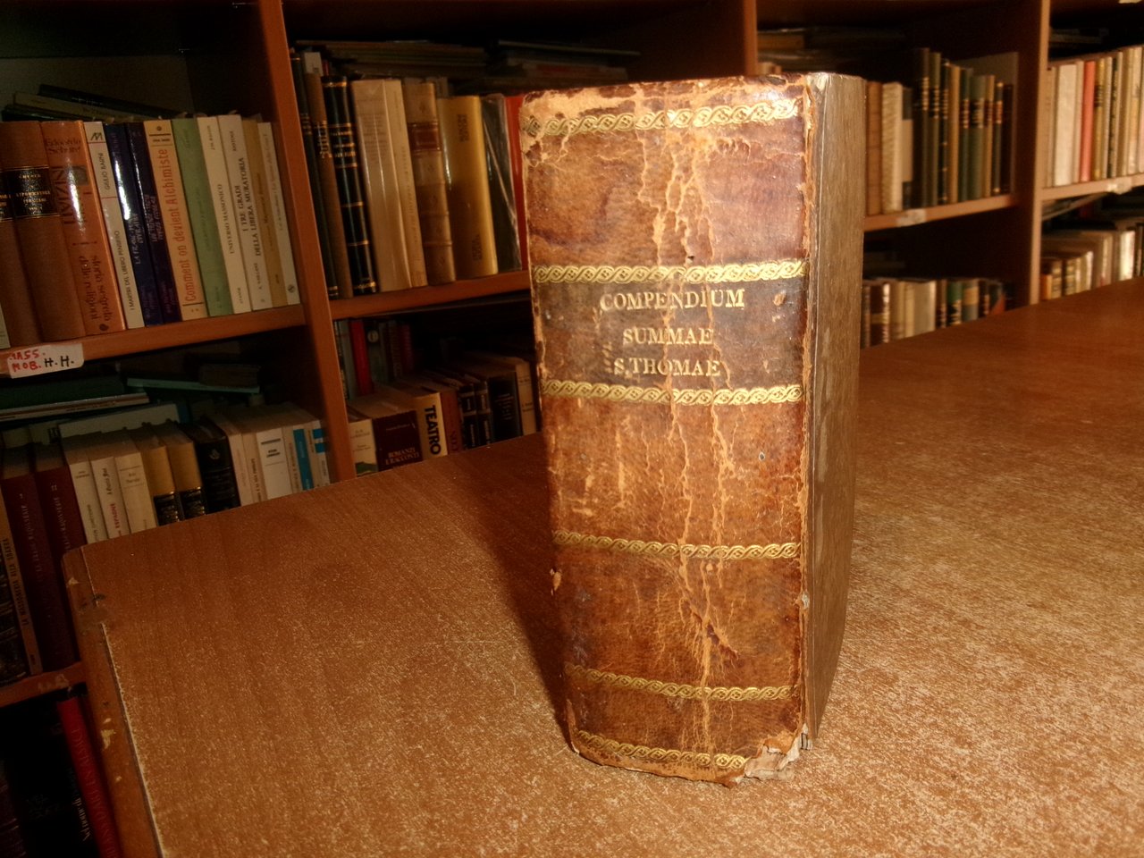 S. THOME AQUINATIS THEOLOGICAE SUMMAE COMPENDIUM. P. PETRO ALAGONA Theologo Societatis DICATUM... D. PETRO BARBADICO Patriarchae Venetiarum DalmatiAeque Primati... Venetiis Apud Franciscum Hertzhauser, MDCCXXIII. In-16°, m-pelle coeva con fregi e titolo in oro al dorso. 1 f. bianco, (34), 780 pp. Piccolo strappo angolare alla base della legatura ma in buono stato di conservazione con testo in latino. Neg. mens. bianca mob. nero entro busta trasp.