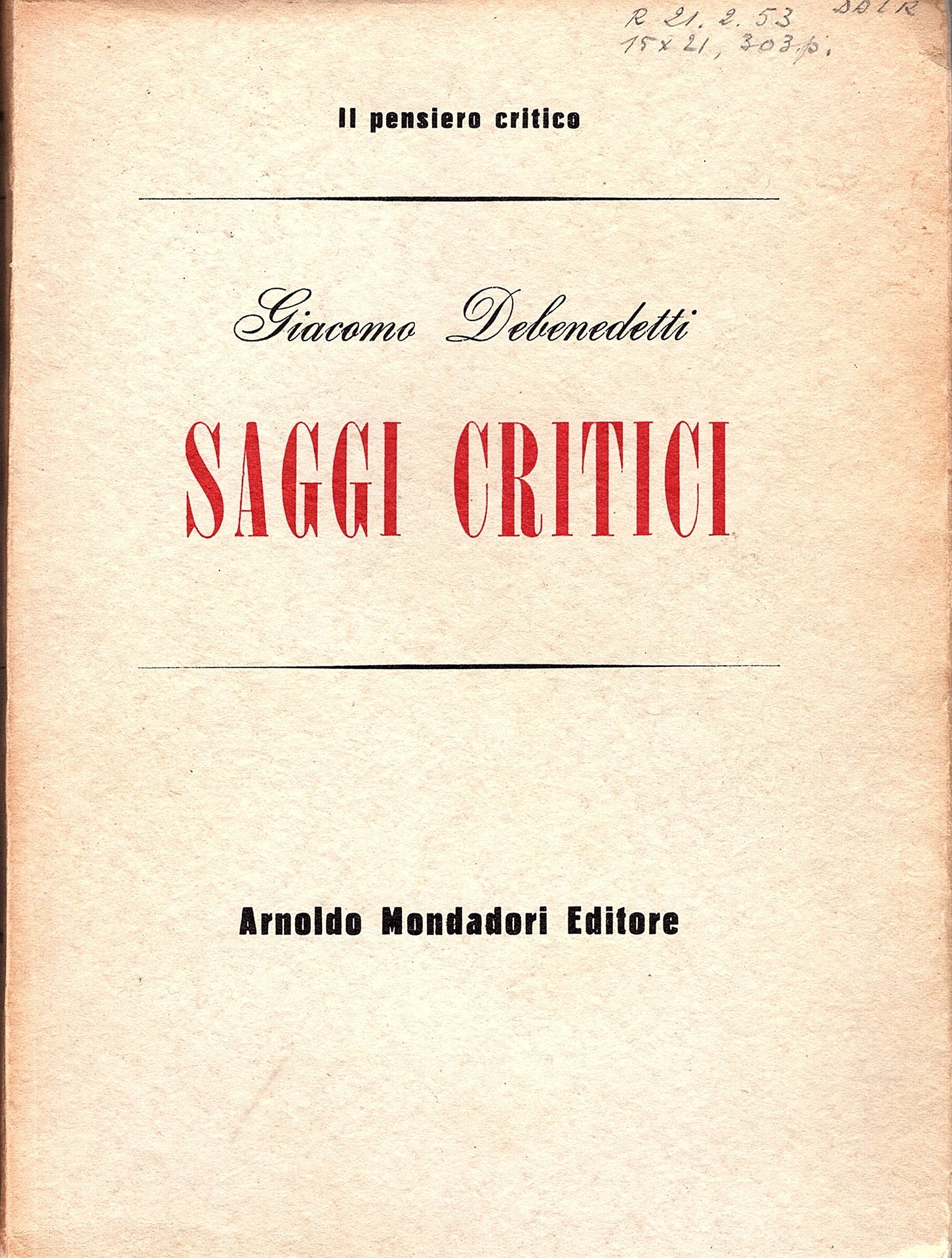 In-8°, pp. (6), 302, (6), brossura editoriale a risvolti paratestuali, titoli in rosso e in nero al dorso e al piatto anteriore. Il pensiero critico, 24. Ottimo esemplare entro velina.