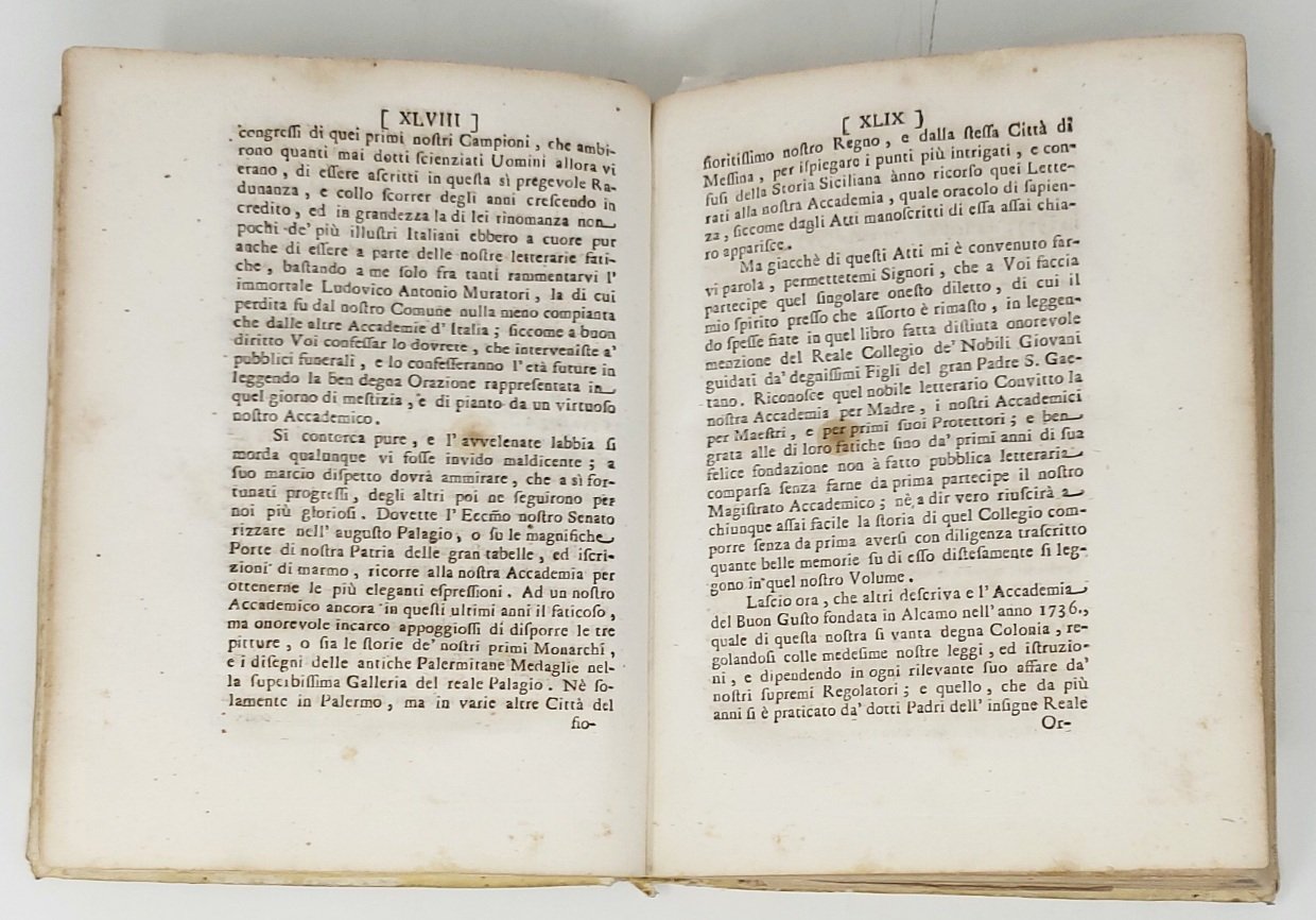 >in-4, pp. (16), LII, 337; leg. coeva p. perg. Emblema dell'Accademia inc. sul tit., testatine, finaletti ed iniz. silogr. e 4 tav. inc. f.t. (di cui 3 più volte ripieg.). Dedica dello stampatore a Pietro Filingeri, Principe di S. Flavia. Prima edizione di questo primo vol. che raccoglie nove importanti scritti concernenti la Sicilia (il II vol. raramente si trova unito perché pubblicato nel 1800, quasi mezzo secolo dopo!). Le 8 Dissertazioni accademiche sono precedute dal vasto ''Saggio sopra la storia letteraria, e le antiche Accademie di Palermo'' di Dom. Schiavo; del medesimo sono anche le disertazioni I, IV e VI (Della necessità, e de' vantaggi delle leggi accademiche; Sopra un talismano di rame degli Eretici Basiliadi; Sopra due tazze suggellate di creta del Museo Martiniano); la dissertaz. II (Delle leggi de' Siciliani) è di Nicolò Gervasi; la III (Delle Università di Sicilia) è di Gius. Santacroce; di notevole importanza archeologica è la dissertaz. V (Sopra un vaso greco-siculo figurato del Museo Martiniano) nella quale Salvatore Maria Di Blasi rivendica alla civiltà siciliana la lavorazione dei vasi detti greco-sicoli che fino ad allora era stata attribuita agli Etruschi; le dissertazioni VII ed VIII (Intorno all'utilità della storia naturale, spezialmente di quella di Sicilia; Sopra un vase di creta greco-siculo rappresentante le cistefore di Cerere) sono rispettivamente di Agostino Tetamo e Gaetano Barbaraci. Esemplare in buono stato (con ex-libris ms. coevo sul tit. ed usuali bruniture della carta). Mira II, 310 (per l'opera compl.). Mira I, 74, 110, 418; II, 327, 339 e 404 (per le singole Dissertazioni). Cicognara 3323.