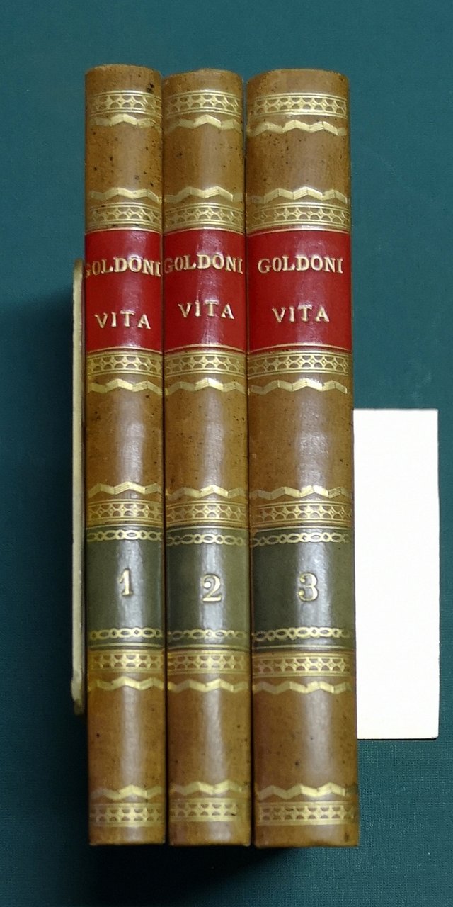 >3 vol. in-16, pp. 191, (3); 211, (1); 283, (5); attraente leg. mod. m. pelle, duplice tass. bicolore ai dorsi con tit. e ricchi fregi oro. Il I vol. ha un ritratto di Goldoni in ovale, dis. da G. Steneri ed inc. da G. Dala e come appendice (pp. 179-189) quattro lettere inedite del Goldoni a Gabriele Cornet; il vol. II è diviso in due parti, contenenti rispettivamente ''Notizie critiche'' e ''Notizie storiche''; il III, benché abbia lo stesso titolo del secondo, ha diverso contenuto: tre Discorsi (sul verso comico, su le commedie dell'arte, su le maschere comiche), Esame critico delle commeie di G. (Distribuzione, Confronti, Giudizi) e 12 Appendici. Cinque ritratti inc. f.t. Ottimo esempl. di quest'importante ed approfondito studio. Della Torre, Saggio bibliogr. opere su G., p. 58.