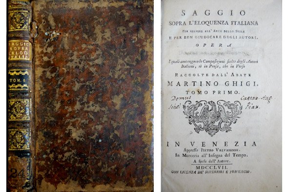 Saggio sopra l'Eloquenza Italiana per servire all'Arte dello Stile e per ben giudicare degli Autori. Tomo Primo, in cui si descrive l'origine, e li progressi della lingua italiana, e si dinotano li piu insigni autori italiani, si in prosa, che in verso.
