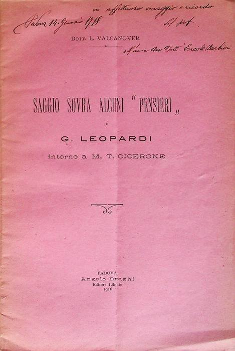 Saggio sovra alcuni "Pensieri" di G. Leopardi intorno a M. T. Cicerone. | Rare and modern books | Valcanover, Lodovico.