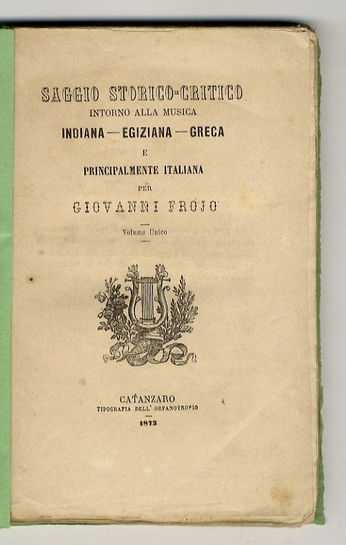 Catanzaro, Tipografia dell'Orfanotrofio, 1873, in-16, brossura fittizia, pp. 201,[5]. Giovanni Frojo [Catanzaro, 1 giugno 1847 - 17 aprile 1925] fu pianista, compositore e autore di diversi scritti di carattere musicologico.