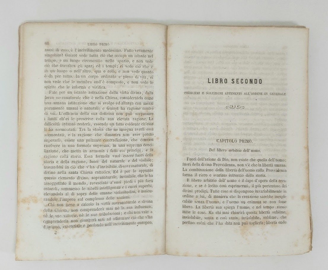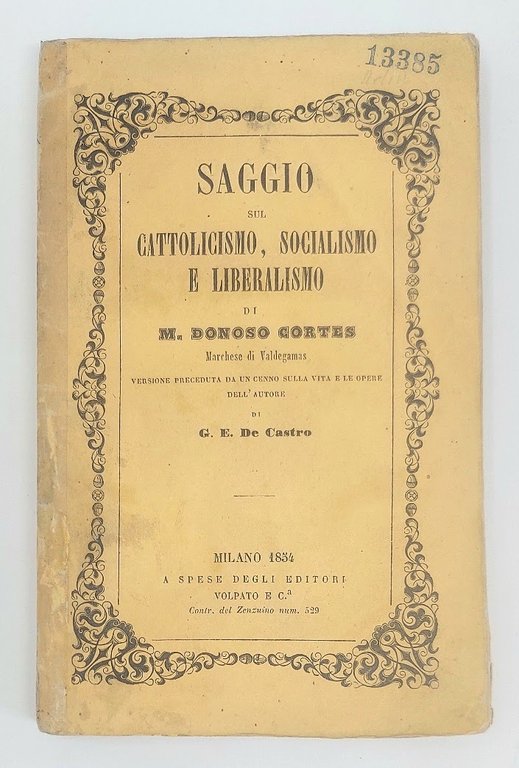 >in-8 (190x120 mm), pp. XIII, 271, brochure originale a stampa (dorso riparato). Rara versione italiana curata da De Castro, di questo celebre saggio del filosofo e polemista spagnolo, dove l'autore teorizzò l'abiura delle idee liberali portata davanti alle "Cortes " spagnole nel 1849. Dorso rinforzato, qualche fioritura alle pagine. Raro a trovarsi completo della brochure che reca la sinossi dell'opera alla IV di copertina. Timbro del Coll. Univ. Antonianum al frontespizio.