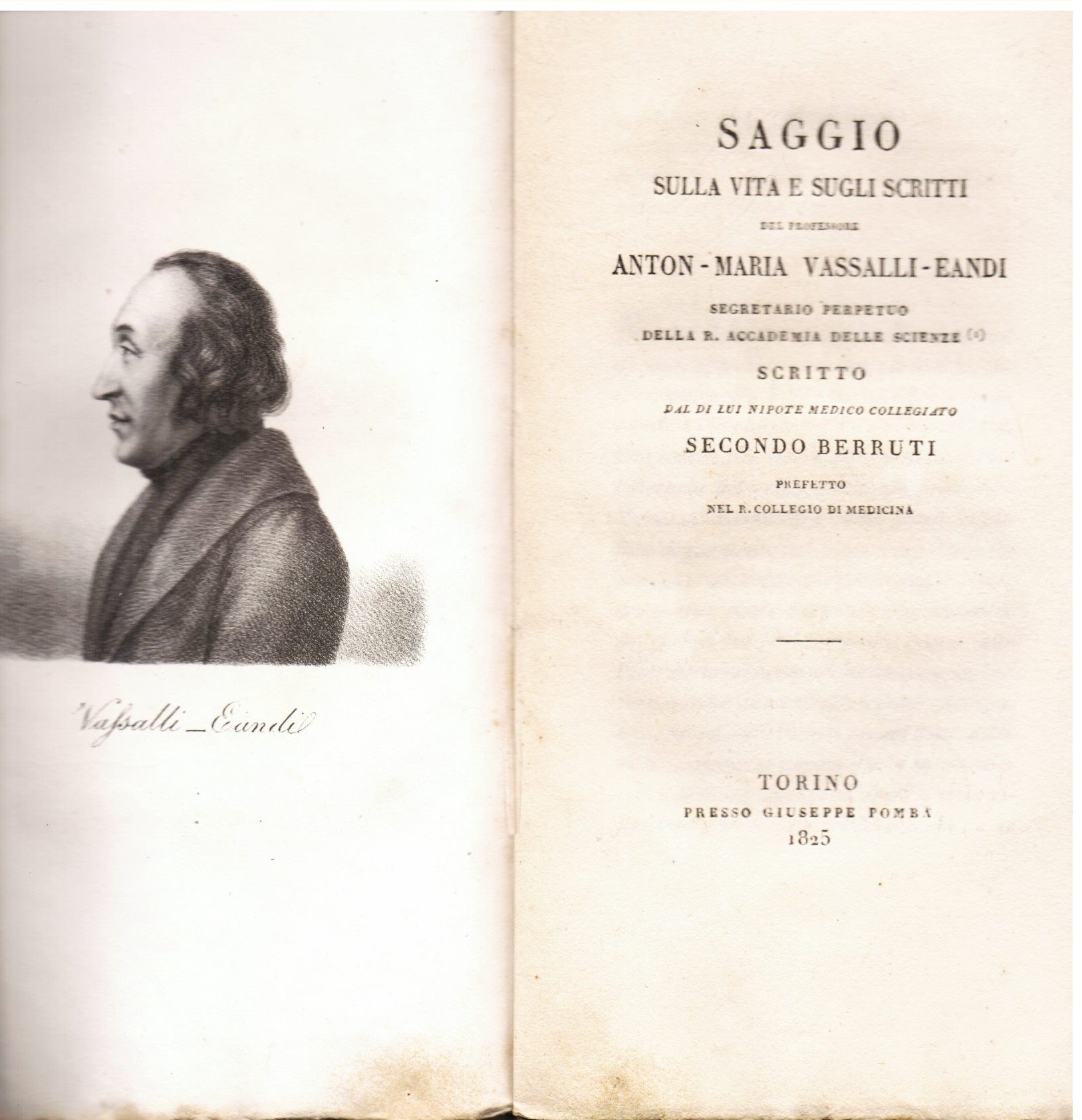 Saggio sulla vita e gli scritti del Professore Anton - Maria Vassalli - Eandi segretario perpetuo della R. Accademia delle Scienze scritto dal di lui nipote medico collegiato Secondo Berruti prefetto del R. Collegio di Medicina