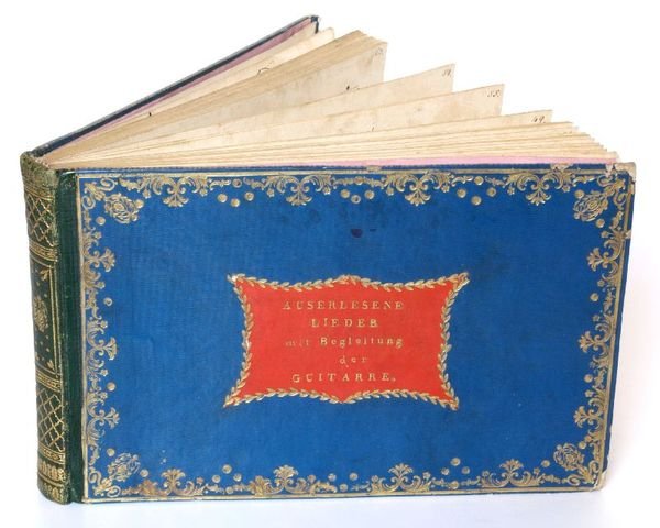 Deutsche Handschrift und Notenhandschrift. Tinte auf Papier. (1) Bl. Widmung, 106, (1) SS. Schöner klassizistischer Halblederband der Zeit mit goldgepr. grünem Lederrücken; die Deckel bezogen mit strukturiertem kobaltblauem Papier mit attraktiver goldgepr. Schmuckordüre; am Vorderdeckel mittig goldumkränzte rote Auflage mit goldgepr. Deckeltitel "Auserlesene Lieder mit Begleitung der Guitarre". Stehkantenvergoldung. Vorsätze aus altrosafarbenem Lackpapier. Dreiseitiger Goldschnitt. Qu.-8vo (222:143 mm). Schöne handschriftliche Sammlung des nicht näher nachweisbaren, wohl österreichischen Gitarrenspielers und Lieddichters, der sich am Widmungsblatt nennt: "Zum Andenken von Franz von Erlach". Die 36 notierten und mit mehrstrophigem Text niedergeschriebenen Lieder aus eigener und fremder Feder sind betitelt "Hedwigs Klage", "Heysa, juhe" (Ariette aus dem tragisch-komischen Original Zauberspiel: Moisasuras Zauberfluch v. Ferd. Raimund. Musik v. eben demselben)", "Die Harfenistin (Erzählung von Lafontaine)", "Aria aus der Schweizer Familie", "Der glückliche Mann", "Schäferlied", "An den Abendstern", "Des Jünglings Klage", "An den Mond (Duetto)", "Liebesklage", "Lied aus der Ferne", "Die Rose", "Die drey Reiche der Natur", "An die Geliebte", "Wenn die Hoffnung nicht wär", "Hektors Abschied von Andromache", "Das Schweitzer Heimweh", "Liebeserklärung", "Der Geisbock und die Todtenbeine", "Mein Garten", "Lied eines österreichischen Landwehrmanns auf Piquet", "Einladung zur Kirchweih (in Baierischer Volksmundart)", "Wiegenlied (v. Körner)", "Der Greis an seine Jugendjahre", "Liebesempfindungen", "Der Schlosser und sein Gesell", "Der Fremdling", "Abschied von der Heimath", "Der Arzt", "Das Schöne", "Sehnsucht um den Geliebten", "Das Nichts", "Die reine Liebe", "An Elise", "Das Echo" und "Liebes-ABC"; nach einem Gesamtregister folgt noch der Text eines Lieds "Der Zigeunerbube im Norden". - Durchgehend etwas gebräunt bzw. braunfleckig; Innengelenke angeplatzt; Ecken minimal bestoßen, sonst von sehr schöner Erhaltung.