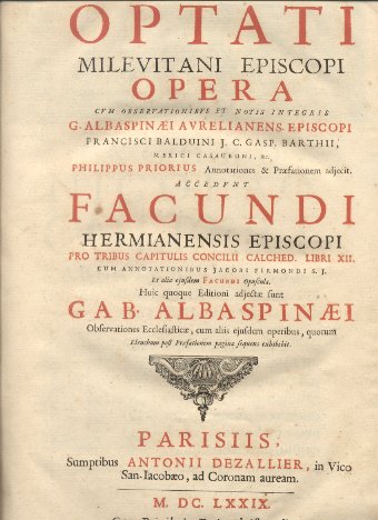 Sancti Optati Milevitani Episcopi, Opera cum observationibus et notis integris G. Albaspinaei Aurelianens. Episcopi , Francisci Balduini J. C. Gasp. Barthii, merici Csauboni , ecc. Philippus Priorius annotationes e praefationem adjecit. Accedunt Facundi Hermianensis Episcopi pro tribus capitulis Concilii Calched. Libri XII cum annotationibus Jacobi Sirmondi S. J. et alia ejusdem Facundi opuscula. Huic quoque editioni adjectae sunt GAb. Albaspinaei observationes Ecclesiasticae, cum aliis ejusdem operibus, quorum elenchum post praefationem pagina sequens exhibebit.