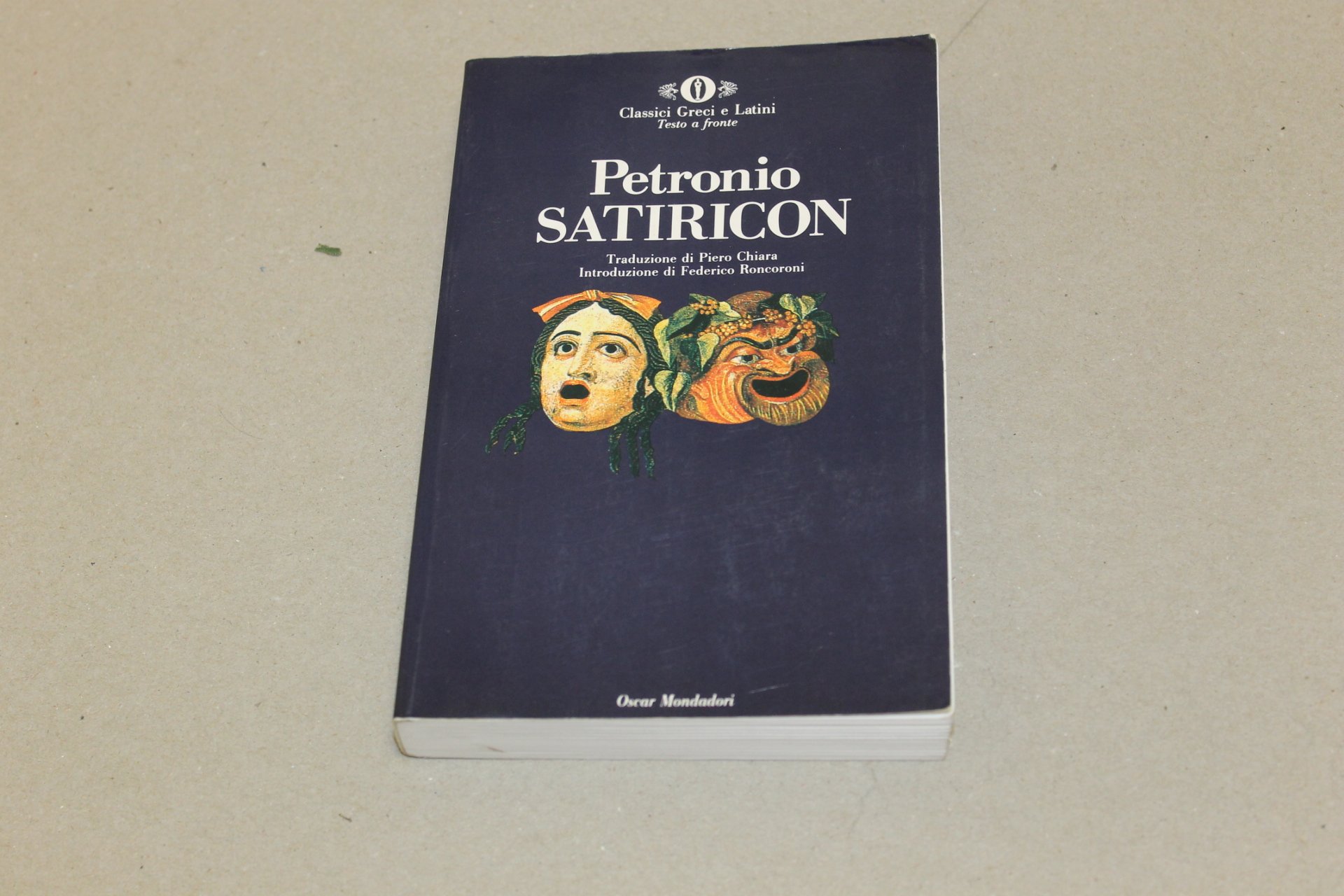 Petronio Satiricon. Milano, Oscar Mondadori 1988 italiano, 19,5 13 pp. 402 Testo latino a fronte. Traduzione di Piero Chiara. Introduzione di Federico Roncoroni. All'interno del testo e in particolare nell'Indice sono presenti alcune scritte e segni a matita. Copertina parzialmente opacizzata. Margini di copertina e del dorso parzialmente usurati.