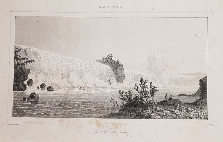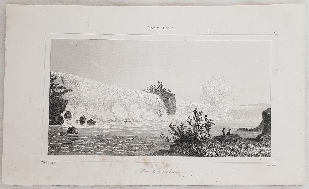 Bella veduta animata delle Cascate del Niagara del 1838 circa. Autore: Nyon su soggetto di Milbert Data: 1838 circa Tecnica: Incisione su acciaio Dimensione della pagina: 12,5x20,5 cm Dimensione dell'incisione: 9,5x16 cm Condizioni. Buone. Alcune rare fioriture.View of Niagara Falls of 1838 circa. Author: Nyon after Milbert Date: 1838 circa Technique: Steel etching Leaf Dimension: 12,5x20,5 cm (4.9x8.1 inches) Engraving Dimension: 9,5x16 cm (3.7x6.3 inches) Conditions: Good conditions. Some foxings.<BR><BR><BR><BR>