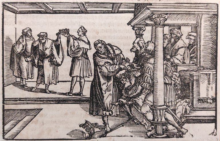 Hans Weiditz è considerato uno dei maestri della xilografia rinascimentale tedesca, insieme a Holbein, Burgkmair e naturalmente Albrecht Dürer. Viene indicato come "Il Maestro Petrarca" in ragione delle oltre 250 illustrazioni xilografiche da lui realizzate per il De Remediis Utriusque Fortunae di Petrarca.Quella qui proposta è una delle incisioni appartenenti a questa suggestiva raccolta. xilografia cm. 10,7 x 16 Buono (Good) Buon es., leggere macchie del tempo.