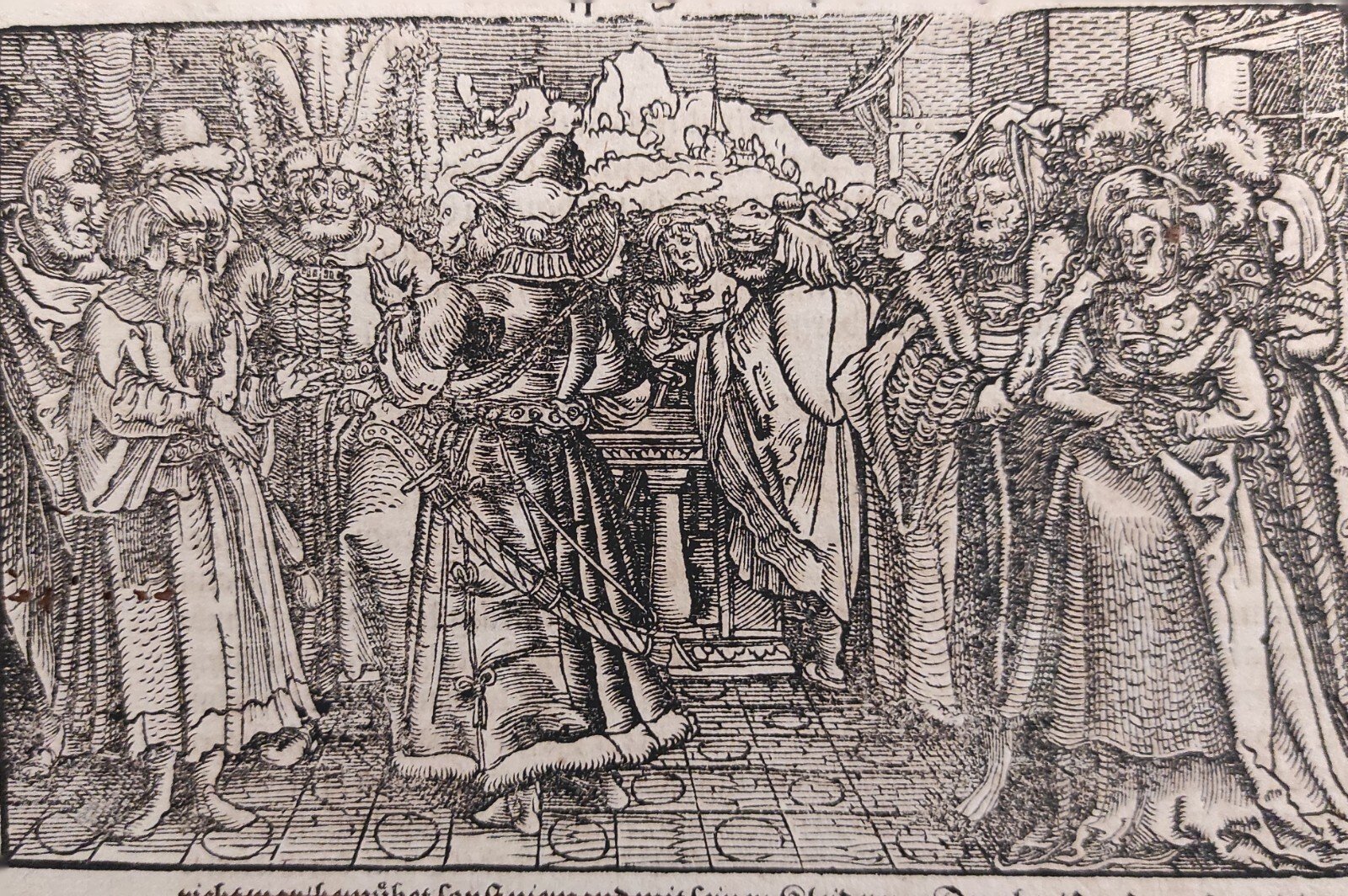 Hans Weiditz è considerato uno dei maestri della xilografia rinascimentale tedesca, insieme a Holbein, Burgkmair e naturalmente Albrecht Dürer. Viene indicato come "Il Maestro Petrarca" in ragione delle oltre 250 illustrazioni xilografiche da lui realizzate per il De Remediis Utriusque Fortunae di Petrarca.Quella qui proposta è una delle incisioni appartenenti a questa suggestiva raccolta. xilografia cm. 10,4 x 16,3 Buono (Good) Buon es., leggere macchie del tempo, fori lato sinistro.