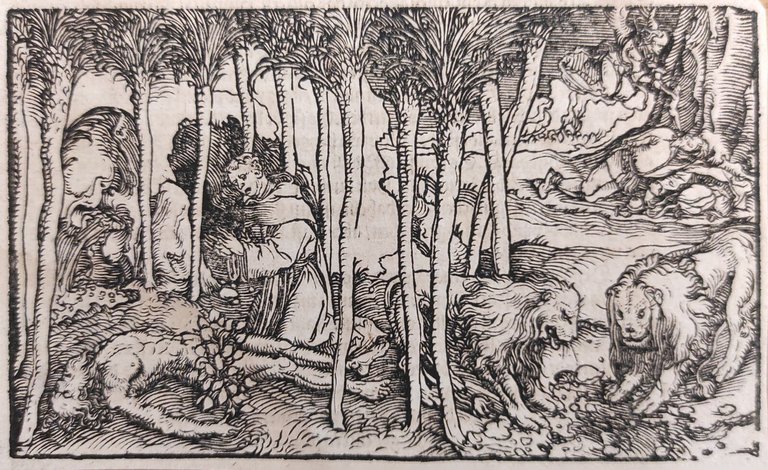 Hans Weiditz è considerato uno dei maestri della xilografia rinascimentale tedesca, insieme a Holbein,  Burgkmair e naturalmente Albrecht Dürer. Viene indicato come  "Il Maestro Petrarca" in ragione delle oltre 250 illustrazioni xilografiche da lui realizzate per il De Remediis Utriusque Fortunae di Petrarca.Quella qui proposta è una delle incisioni appartenenti a questa suggestiva raccolta. xilografia cm. 9,7 x 16 Buono (Good) Buon es., leggere macchie del tempo.