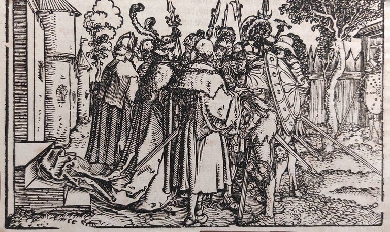 Hans Weiditz è considerato uno dei maestri della xilografia rinascimentale tedesca, insieme a Holbein, Burgkmair e naturalmente Albrecht Dürer. Viene indicato come "Il Maestro Petrarca" in ragione delle oltre 250 illustrazioni xilografiche da lui realizzate per il De Remediis Utriusque Fortunae di Petrarca.Quella qui proposta è una delle incisioni appartenenti a questa suggestiva raccolta. xilografia cm. 10 x 15,5 Buono (Good) Buon es., leggere macchie del tempo.