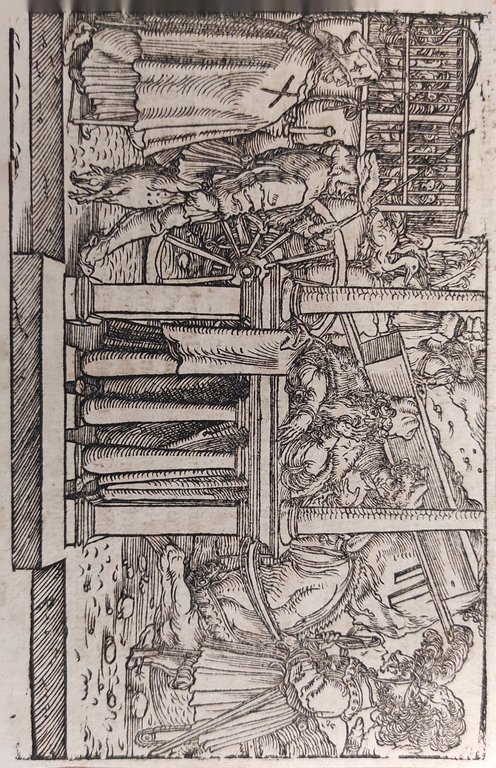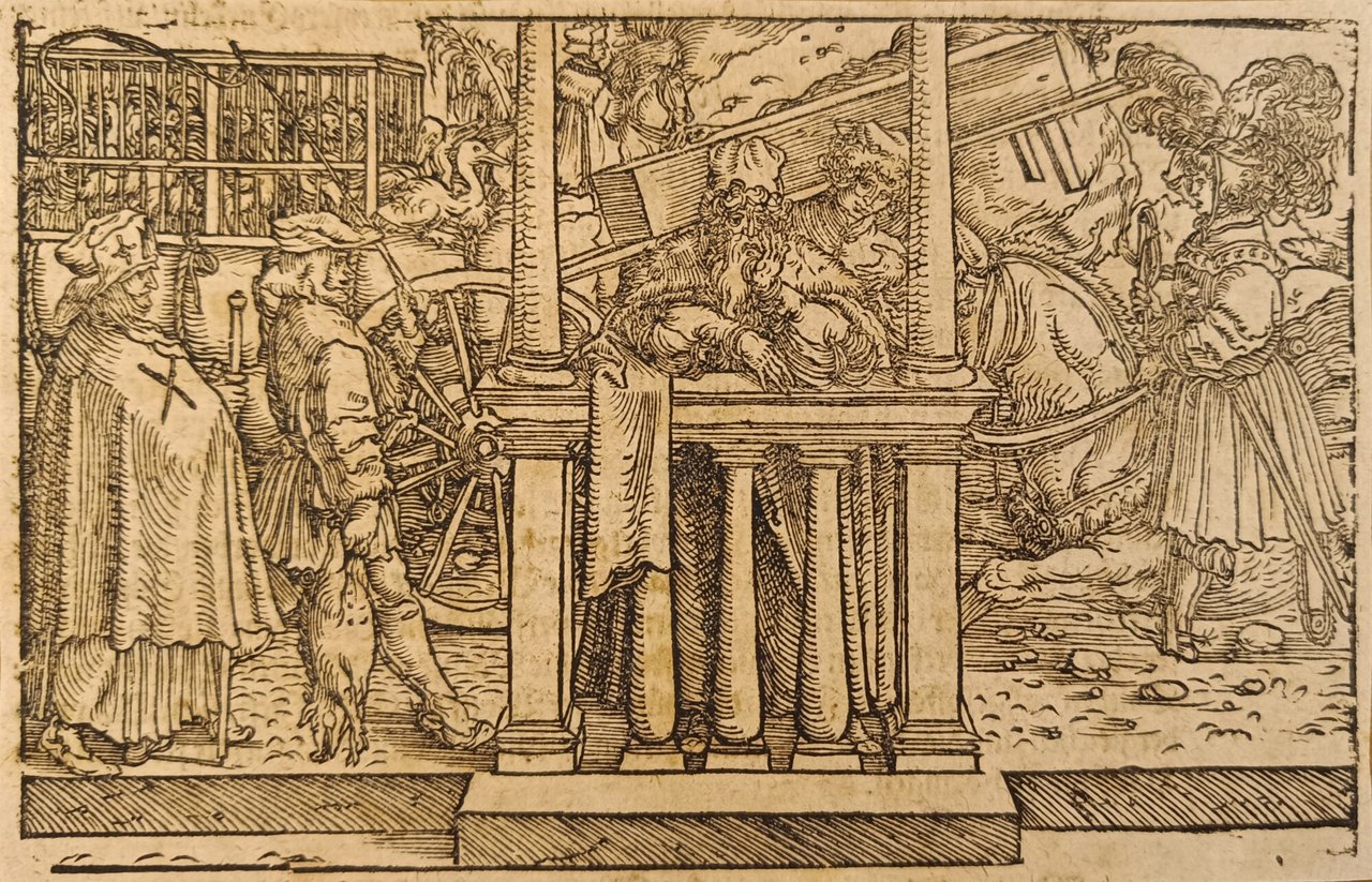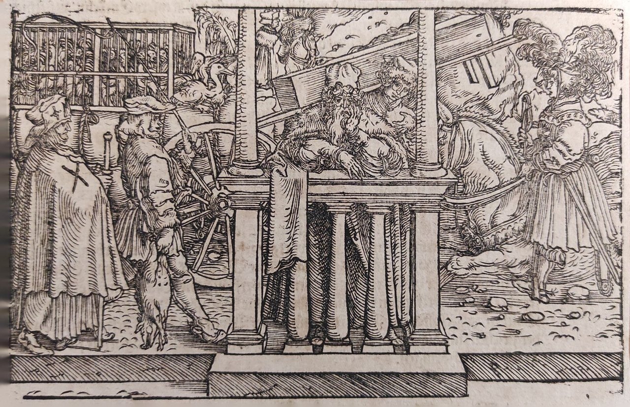 Hans Weiditz è considerato uno dei maestri della xilografia rinascimentale tedesca, insieme a Holbein, Burgkmair e naturalmente Albrecht Dürer. Viene indicato come "Il Maestro Petrarca" in ragione delle oltre 250 illustrazioni xilografiche da lui realizzate per il De Remediis Utriusque Fortunae di Petrarca.Quella qui proposta è una delle incisioni appartenenti a questa suggestiva raccolta. xilografia cm. 10,4 x 15,8 Buono (Good) Buon es., leggere macchie del tempo.