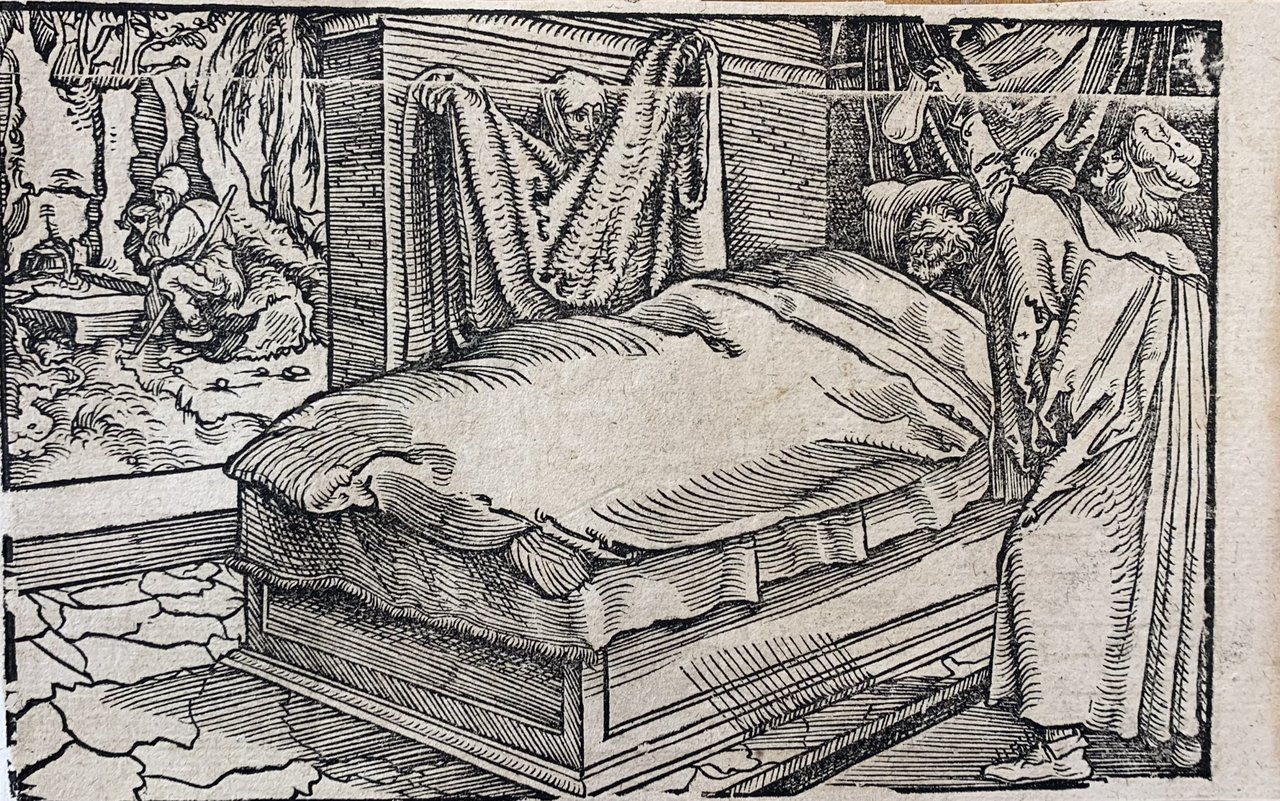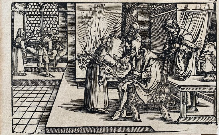 Hans Weiditz è considerato uno dei maestri della xilografia rinascimentale tedesca, insieme a Holbein, Burgkmair e naturalmente Albrecht Dürer. Viene indicato come "Il Maestro Petrarca" in ragione delle oltre 250 illustrazioni xilografiche da lui realizzate per il De Remediis Utriusque Fortunae di Petrarca.Quella qui proposta è una delle incisioni appartenenti a questa suggestiva raccolta. xilografia cm. 10,5 x 16,8 Buono (Good) Buon es., leggere macchie del tempo.