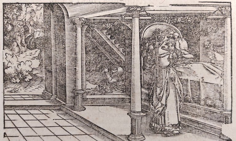 Hans Weiditz è considerato uno dei maestri della xilografia rinascimentale tedesca, insieme a Holbein, Burgkmair e naturalmente Albrecht Dürer. Viene indicato come "Il Maestro Petrarca" in ragione delle oltre 250 illustrazioni xilografiche da lui realizzate per il De Remediis Utriusque Fortunae di Petrarca.Quella qui proposta è una delle incisioni appartenenti a questa suggestiva raccolta. xilografia cm. 10 x 16 Buono (Good) Buon es., leggere macchie del tempo.