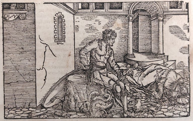 Hans Weiditz è considerato uno dei maestri della xilografia rinascimentale tedesca, insieme a Holbein,  Burgkmair e naturalmente Albrecht Dürer. Viene indicato come  "Il Maestro Petrarca" in ragione delle oltre 250 illustrazioni xilografiche da lui realizzate per il De Remediis Utriusque Fortunae di Petrarca.Quella qui proposta è una delle incisioni appartenenti a questa suggestiva raccolta. xilografia cm. 10,2 x 16,1 Buono (Good) Buon es., leggere macchie del tempo.