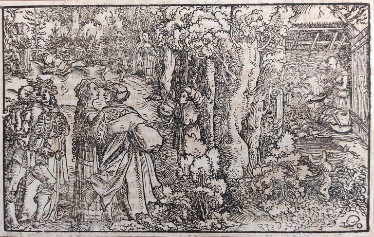 Hans Weiditz è considerato uno dei maestri della xilografia rinascimentale tedesca, insieme a Holbein,  Burgkmair e naturalmente Albrecht Dürer. Viene indicato come  "Il Maestro Petrarca" in ragione delle oltre 250 illustrazioni xilografiche da lui realizzate per il De Remediis Utriusque Fortunae di Petrarca.Quella qui proposta è una delle incisioni appartenenti a questa suggestiva raccolta. xilografia cm. 10,3 x 16 Buono (Good) Buon es., leggere macchie del tempo.