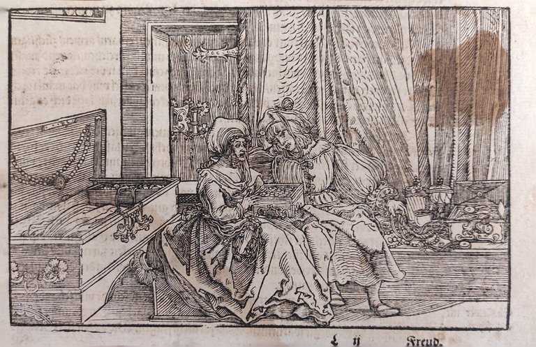 Hans Weiditz è considerato uno dei maestri della xilografia rinascimentale tedesca, insieme a Holbein,  Burgkmair e naturalmente Albrecht Dürer. Viene indicato come  "Il Maestro Petrarca" in ragione delle oltre 250 illustrazioni xilografiche da lui realizzate per il De Remediis Utriusque Fortunae di Petrarca.Quella qui proposta è una delle incisioni appartenenti a questa suggestiva raccolta. xilografia cm. 11 x 17 Buono (Good) Buon es., gora in basso a sinistra.