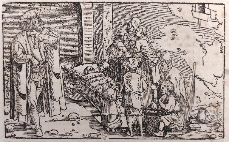 Hans Weiditz è considerato uno dei maestri della xilografia rinascimentale tedesca, insieme a Holbein,  Burgkmair e naturalmente Albrecht Dürer. Viene indicato come  "Il Maestro Petrarca" in ragione delle oltre 250 illustrazioni xilografiche da lui realizzate per il De Remediis Utriusque Fortunae di Petrarca.Quella qui proposta è una delle incisioni appartenenti a questa suggestiva raccolta. xilografia cm. 10,4 x 16,4 Buono (Good) Buon es., leggere macchie del tempo.