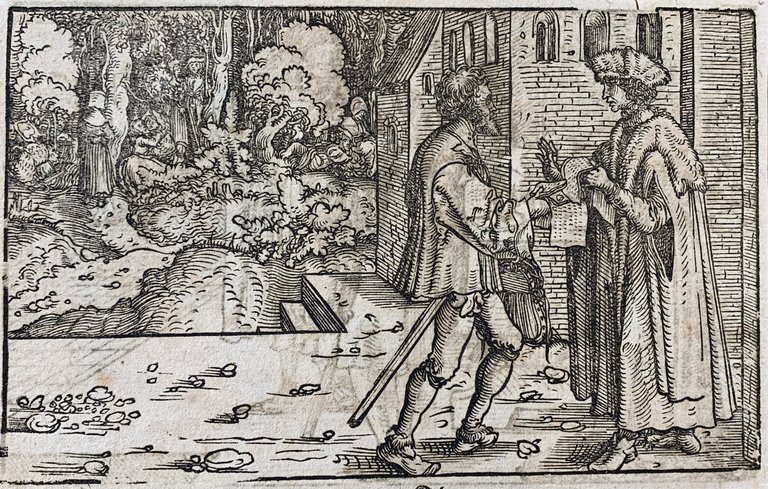 Hans Weiditz è considerato uno dei maestri della xilografia rinascimentale tedesca, insieme a Holbein,  Burgkmair e naturalmente Albrecht Dürer. Viene indicato come  "Il Maestro Petrarca" in ragione delle oltre 250 illustrazioni xilografiche da lui realizzate per il De Remediis Utriusque Fortunae di Petrarca.Quella qui proposta è una delle incisioni appartenenti a questa suggestiva raccolta. xilografia cm. 10,5 x 16 Buono (Good) Buon es., leggere macchie del tempo.