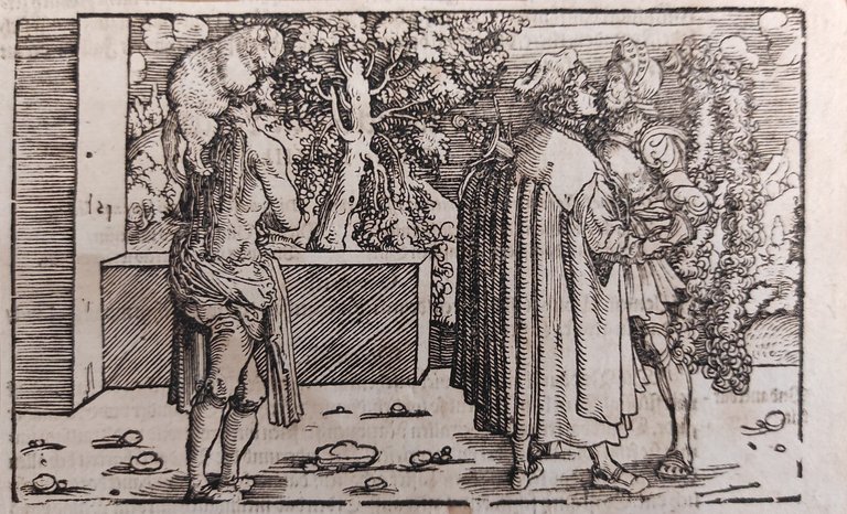 Hans Weiditz è considerato uno dei maestri della xilografia rinascimentale tedesca, insieme a Holbein,  Burgkmair e naturalmente Albrecht Dürer. Viene indicato come  "Il Maestro Petrarca" in ragione delle oltre 250 illustrazioni xilografiche da lui realizzate per il De Remediis Utriusque Fortunae di Petrarca.Quella qui proposta è una delle incisioni appartenenti a questa suggestiva raccolta. xilografia cm. 10,2 x 16,8 Buono (Good) Buon es., leggere macchie del tempo.
