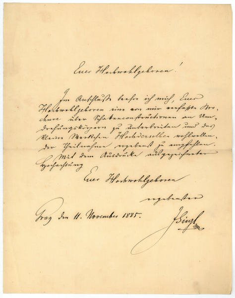1 Tafel, 28, (2) SS. OBr. Brief: 1 S. 4to. Der Begleitbrief (dat. Prag, 11. XI. 1885) an einen namentlich nicht genannten Adressaten. - Etwas angestaubt; der Umschlag mit kl. Aus- und Einrissen.