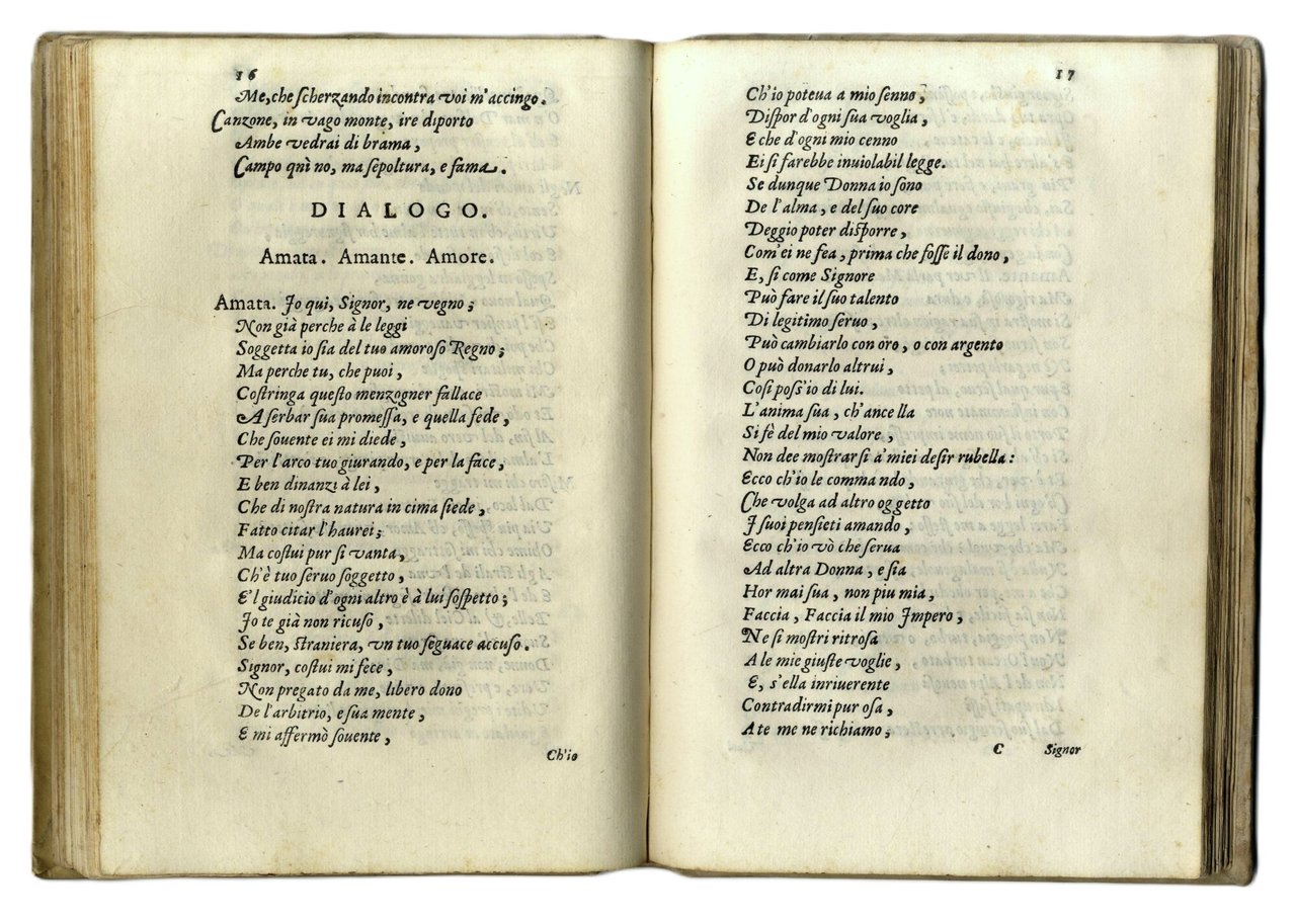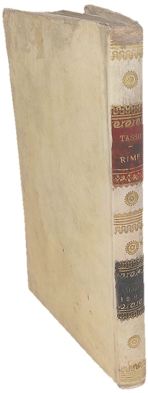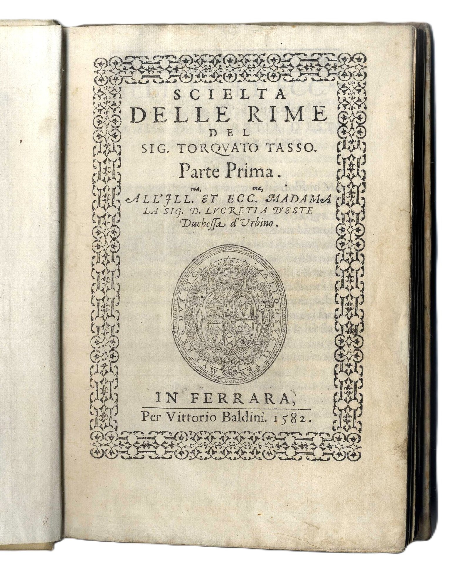 >2 parti in un vol. in-4, ff. (4, di cui l'ultimo bianco), pp. 95, (5); 93, (3), car. corsivo; legatura 700sca in piena pergamena, fregi oro e titolo su duplice tassello al dorso. Titolo racchiuso in bordura xilogr., al centro stemma di Alfonso II d'Este; in fine grande impresa tipografica, due iniziali xilogr. istoriate. Lettera dedicatoria a Lucrezia d'Este Duchessa d'Urbino dat. «dì ultimo Novembre 1581». Rara seconda edizione delle Rime, ristampa curata, purgata e corretta da Gio. Batt. Guarini, in seguito al successo riscosso dalle medesime Rime apparse per la prima volta l'anno precedente presso Aldo. ''Merita preferenza sull'antecedente ... fu ricevuta con tanto plauso'' (Gamba). Ottimo esemplare (con ex-libris Marie Book). Gamba 968. Tassiana 1104 (erra la collazione). Manca ad Adams e BMC.