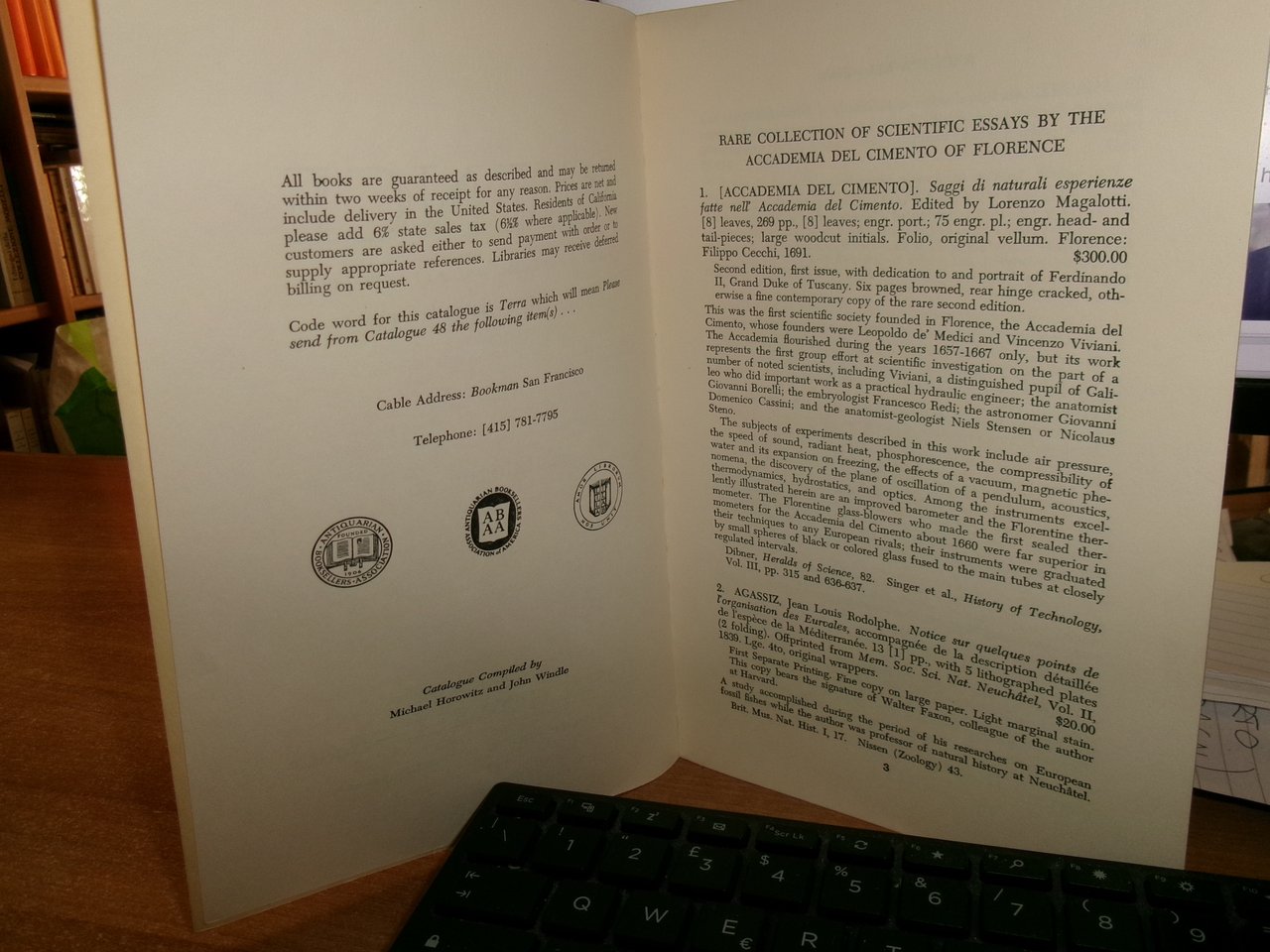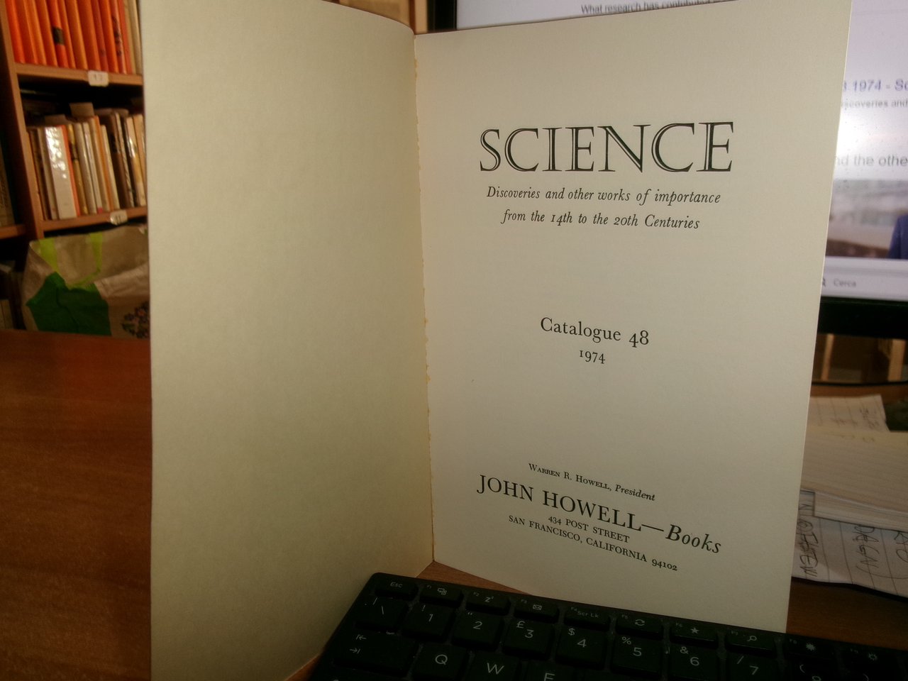 JOHN HOWELL. San Francisco California, John Howell Books, 1974. SCIENCE discoveries and the hother works of importance from the 14th to the 20th Centuries. Catalogue 48. In-8°, br. 111 pp. Ottimo stato. Neg. mob. nero 9