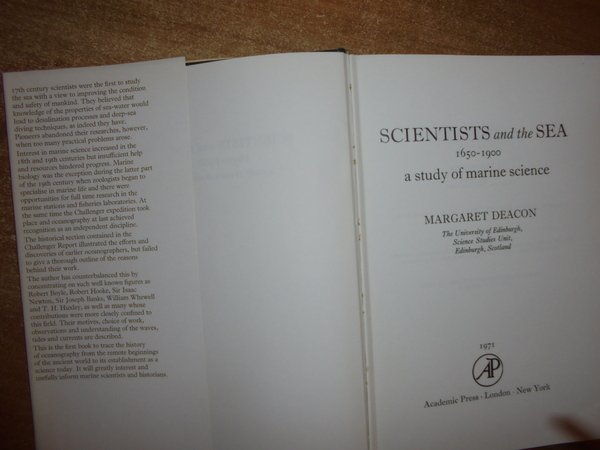 MARGARET, DEACON. London and New York, Academic Press, 1971. SCIENTIST and the SEA 1650-1900 a Study of Marine Science. In-8° piccolo, pelle edit. bleu con titolo in oro al dorso, sovracopertina illustrata. xvi, 445 pp. con illustrazioni nel testo. In ottimo stato di conservazione. Uff. C - II - 4
