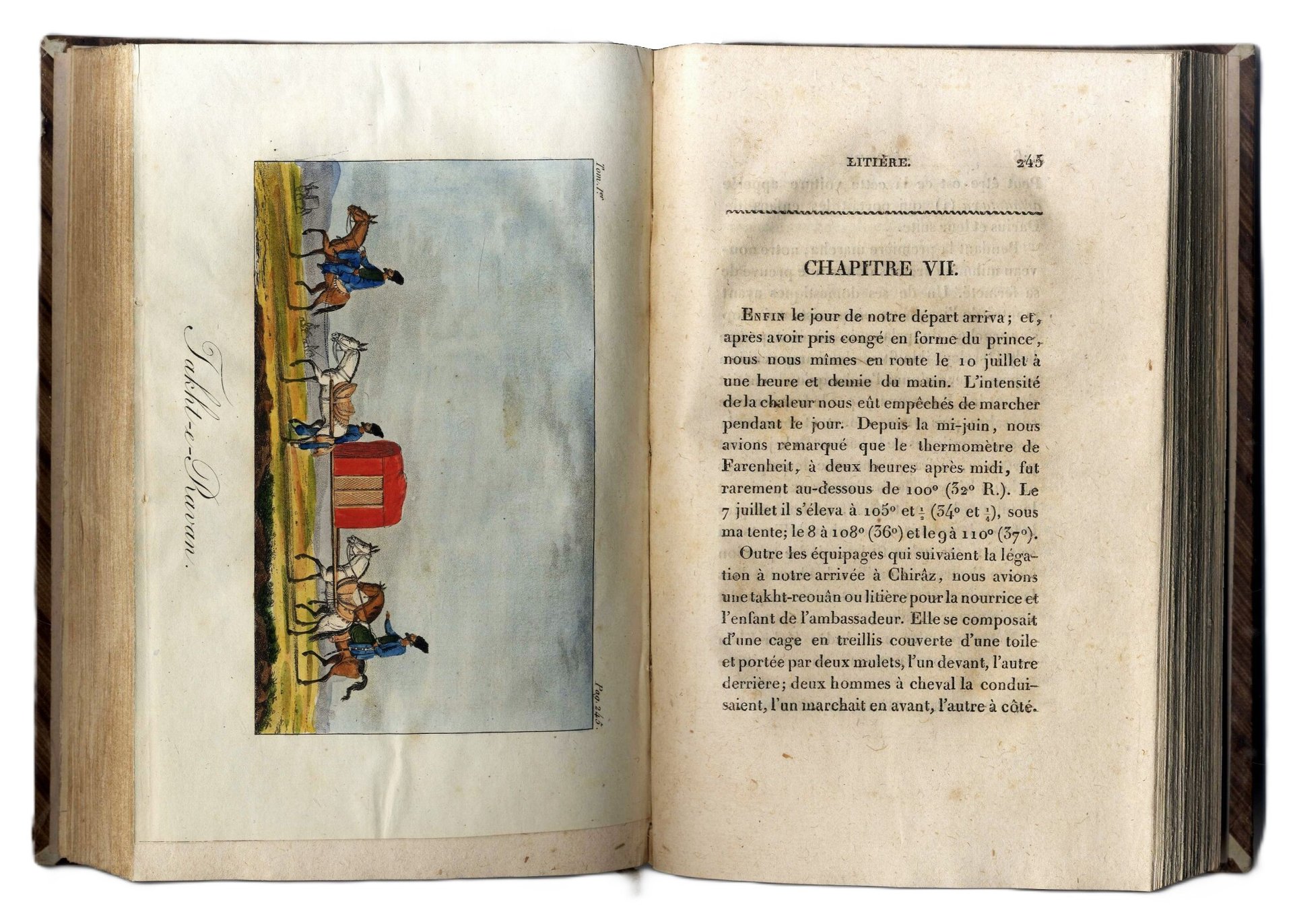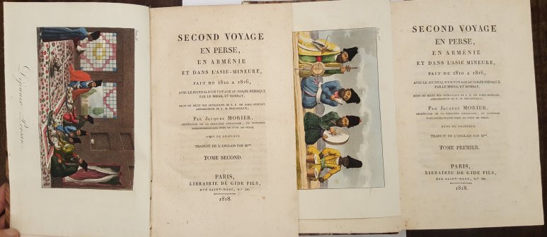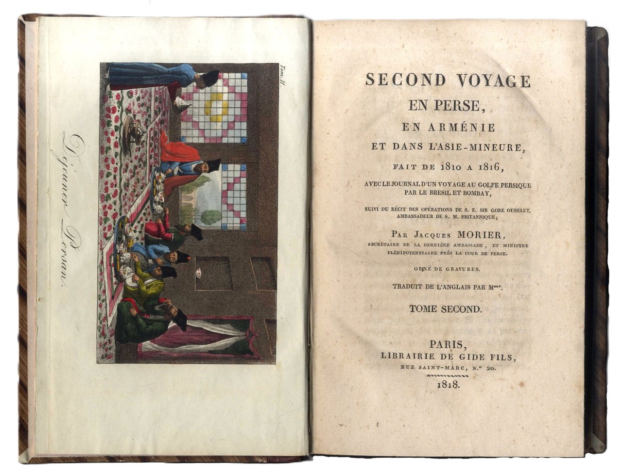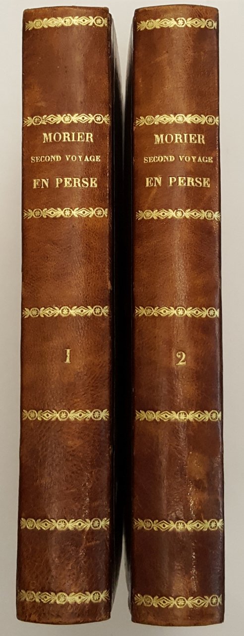 >2 vol. in-8 (200x125 mm), pp. 464 (le prime 10 in numeraz. romana); 462; leg. del tempo mezza pelle, titolo e fregi oro ai dorsi. Con 4 tavole f.t. finemente incise all'acquatinta a colori. Prima edizione francese, tradotta dall'inglese da Eyriès. Ministro plenipotenziario presso la Corte di Persia, Morier era stato incaricato nel 1809 di accompagnare in Inghilterra una legazione persiana comandata da Mirza Abul Hassan. Egli pubblicò allora la relazione di quella spedizione nel suo "Premier voyage en Perse". Nel 1810 riaccompagnò i Persiani nel loro paese, con una spedizione diretta dall'ambasciatore Sir Gore Ouseley, la cui prima tappa fu Rio de Janeiro; successivamente passò in India e poi nel Golfo Persico. Vi sono dettagliatamente descritti città e paesi, luoghi interessanti e curiosi, usanze popolari, credenze religiose, costumi di vita, rapporti con governatori e re, economia, manufatti, avventure, ecc. Bell'esemplare. Schwab 400. Borba de Moraes II, p. 497.