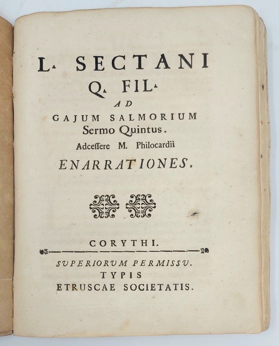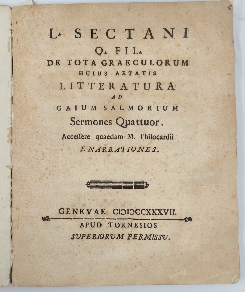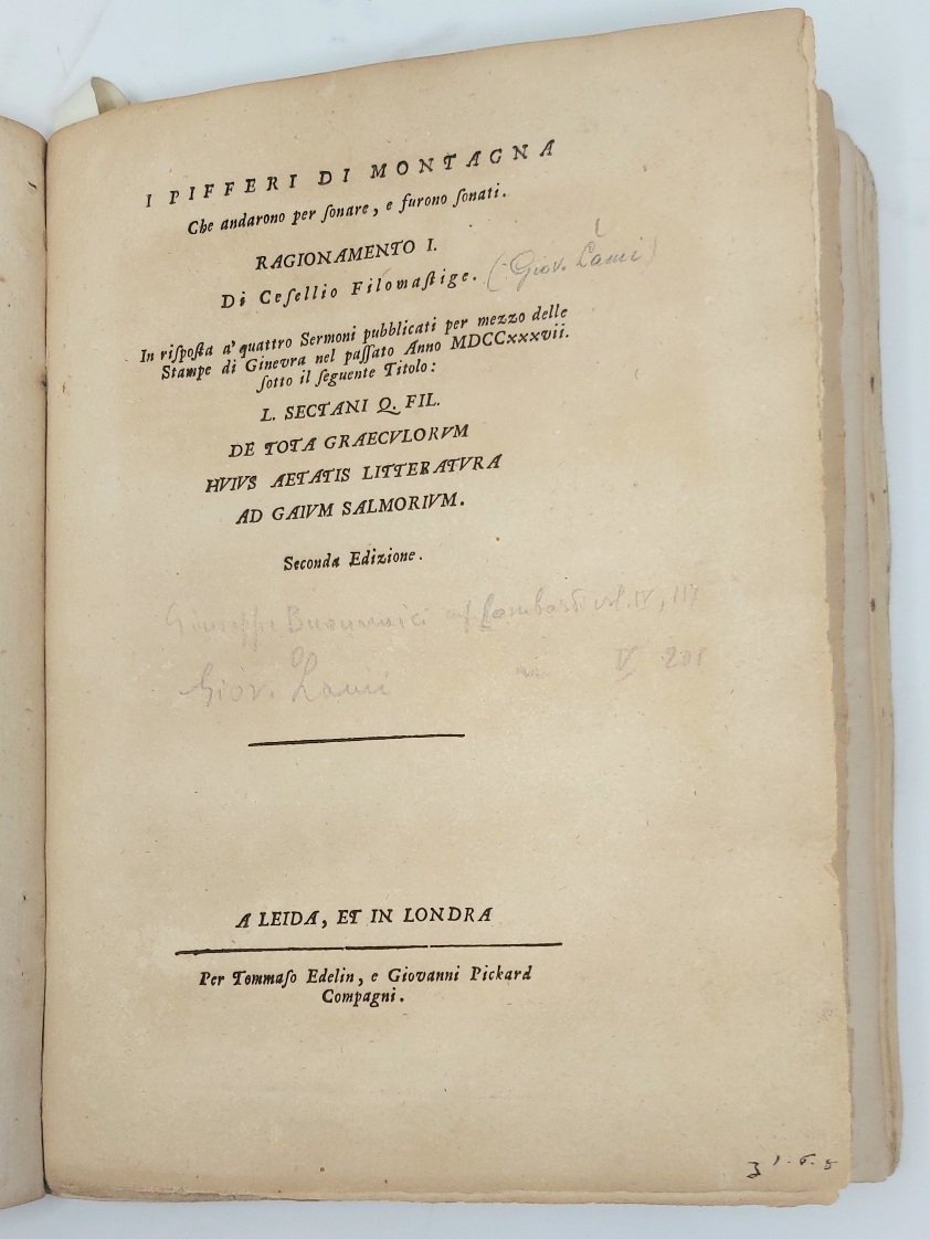 Sectani Q. fil. De tota Graeculorum huius aetatis litteratura ad Gaium Salmorium sermones quattuor… (leg con:) I pifferi di montagna che andarono per sonare, e furono sonati. Ragionamento I. Di Cesellio Filomastige. In risposta a'quattro Sermoni pubblicati per mezzo delle Stampe di Ginevra nel passato Anno MDCCxxxvii apud Tornesios, Genevae (Lucca), 1737 (segue:) L, Sectani Q.Fil. ad gajum Salmorium Sermo Quintus…Corythi, Typis Etruscae Societatis,