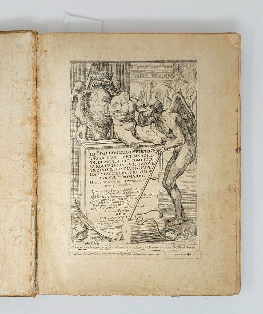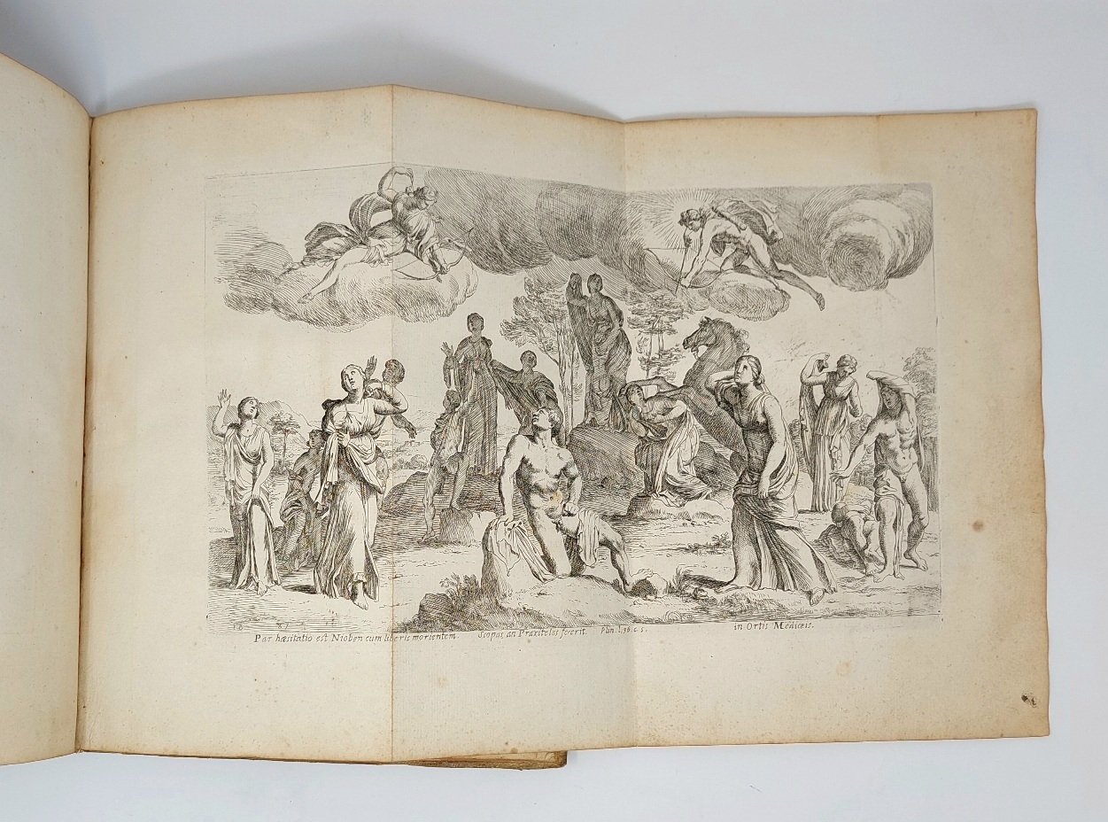 >in-folio (325x222), frontespizio con dedica "Illmo. D.D.Rogerio du Plessis Dno. de Liancourt Marchioni de Montfort..." e 100 tavole numerate 1-100 (2 ripiegate), 1 foglio di "Index Signorum et Statuarum" datato 1638. Legatura coeva in piena pergamena rigida con tracce di antichi legacci, restauri al dorso e taglio al piatto superiore, dorso a nervi. Frontespizio inciso, raffigurante un anziano angelo nudo con in mano la falce ed in bocca un frammento di antica scultura. Dedica e titolo della raccolta impresso su una colonna, nella parte superiore della struttura, una scultura e due putti con in mano uno stemma, per terra, la testa della statua e un serpente che si morde la coda. Le incisioni raffigurano le più famose statue greche, romane e rinascimentali esistenti a Roma nel sec. XVII e recano il monogramma dell'artista François Perrier (1596-1650) dettò il Borgognone ( monogramma FPB, con F e P sovrapposte) e di Henri-Roger Du Plessis. La tavola n. 1 è firmata per esteso: "Perrier Burgund. delin. et sculp. Romæ superior-licentia 1638". L'opera venne pubblicata la prima volta a Roma nel 1638; i cinque stati noti del frontespizio testimoniano che la serie ha avuto più edizioni. Sul frontespizio la dicitura "Roma 1638", sotto l'immagine due diversi indirizzi di editori parigini: "La veuve du défunt Perrier" e "La veuve de F. Chereau" (attiva a Parigi tra il 1729 e il 1755). François Perrier (1590-1650) pittore e incisore francese attivo a Roma, cofondatore dell'Académie Royale de peinture et de sculpture. A metà del XVI secolo furono pubblicate numerose stampe di scultura greco-romana, ma la selezione di Perrier fu la prima a includere solo i capolavori. La sua collezione fu imitata da moltissime edizioni contemporanee e successive, ma continuò a essere ampiamente utilizzata e stabilì il canone. Bellissima opera, non comune completa di tutte le tavole; discreto esemplare con segni d'uso (macchia d'umido nel margine interno degli ultimi 10 fogli ed un piccolo forellino di tarlo nel margine bianco di metà volume, fronstespizio e primi fogli polverosi, sporadici strappi marginali e macchie d'inchiostro nero ai tagli, scritta in sanguigna al verso della tavola 100 e scarabocchi al lapis sul margine inferiore dell'indice).