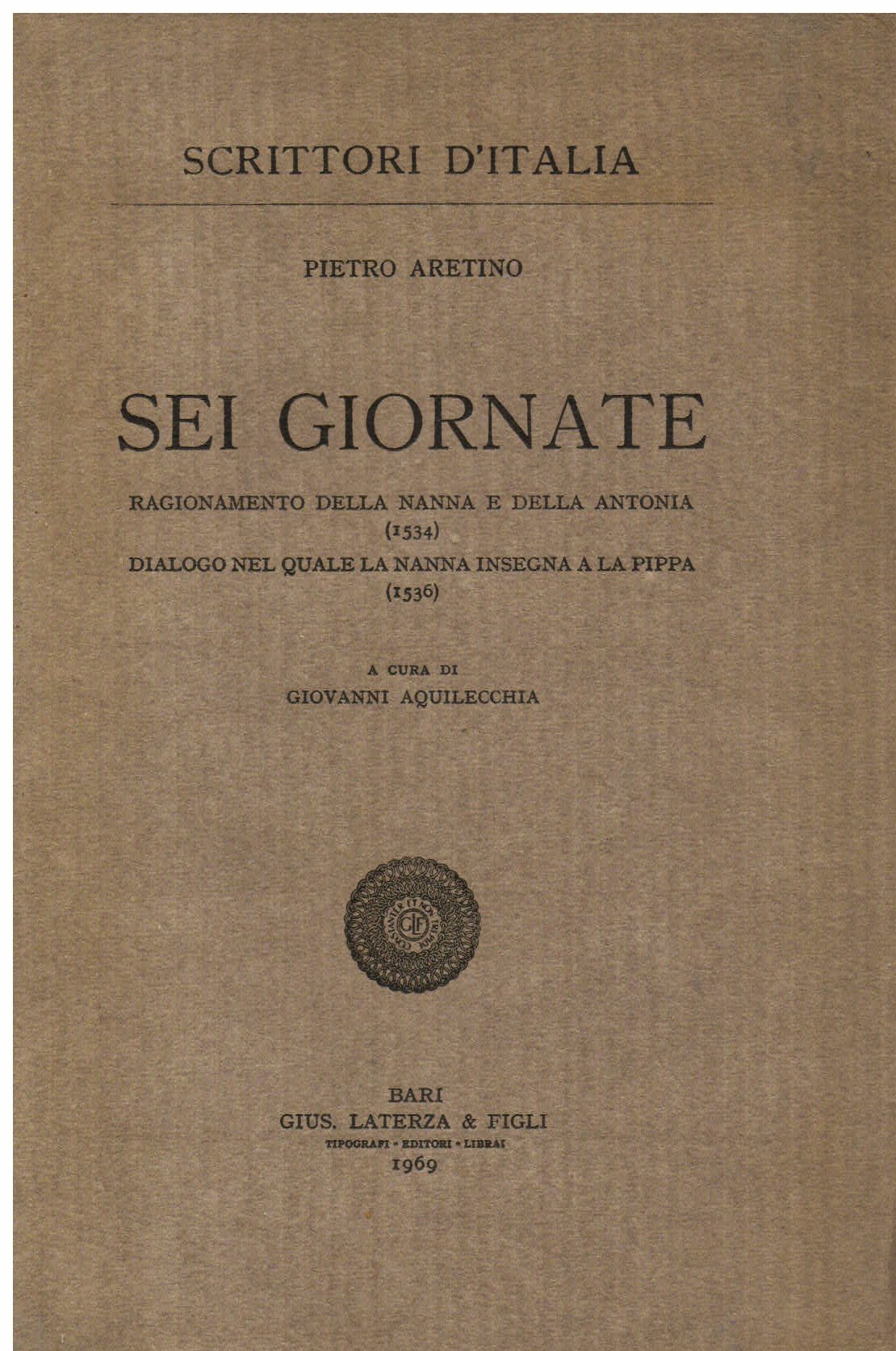 Sei giornate. Ragionamento della Nanna e della Antonia (1534) Dialogo nel quale la Nanna insegna a la Pippa (1536). A cura di Giovanni Aquilecchia