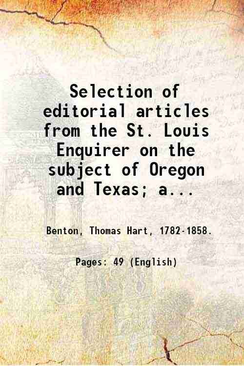 Selection of editorial articles from the St. Louis Enquirer on the subject of Oregon and Texas; as originally published in that paper and written by the Hon. T. H. Benton ; to which is prefixed his speech in the Senate of the U. S. in March, 1825, on the bill for the occupation of the Columbia River. 1844