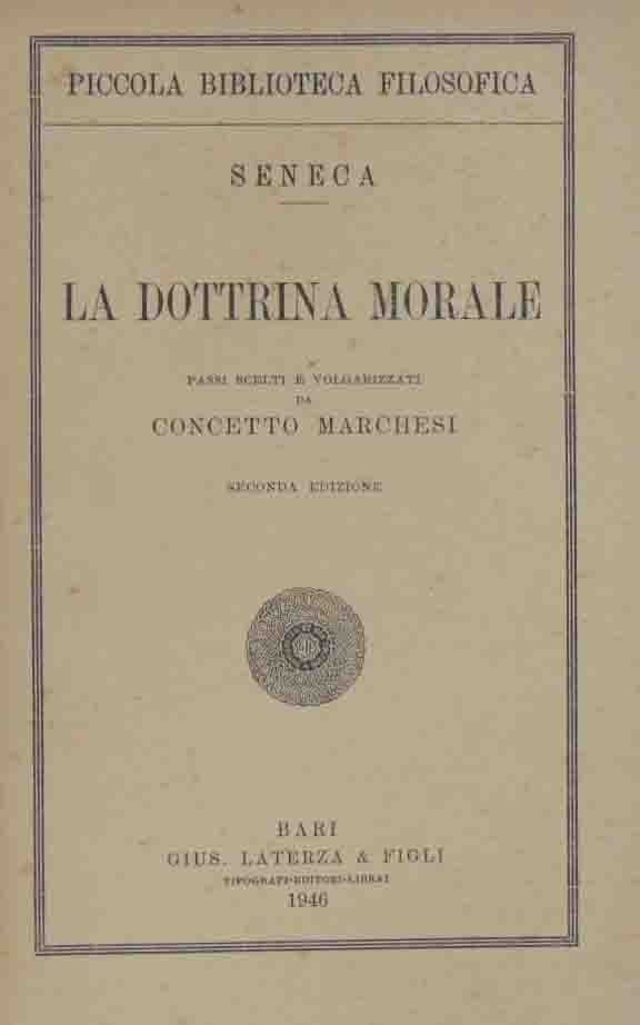 Seneca, La dottrina morale, passi scelti e volgarizzati da Concetto Marchesi, Gius. Laterza e Figli Tipografi-Editori-Librai, Bari 1946, seconda ed., pp. 66, cm 21, br. ed. Collana Piccola Biblioteca Fiolosofica. Dorso restaurato, minime fioriture, carta lievemente brunita, qualche sgualcitura, per il resto buona copia.
