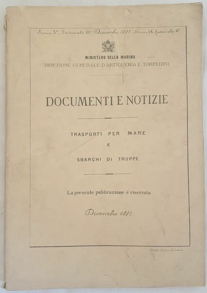 SERIE 3 FACICOLO 11 DICEMBRE 1882 ANNO IX FASCICOLO 4 MINISTERO DELLA MARINA DOCUMENTI E NOTIZIE TRASPORTI PER MARE E SBARCHI DI TRUPPE DICEMBRE 1882