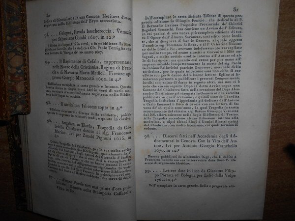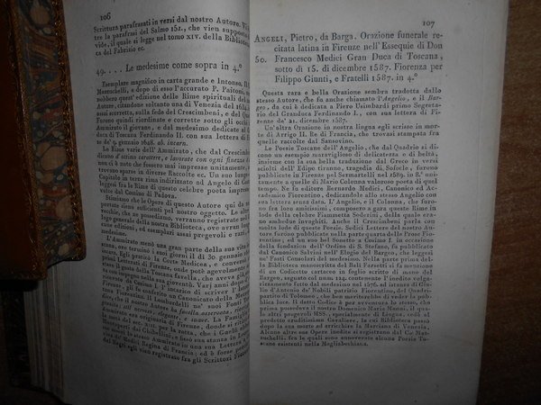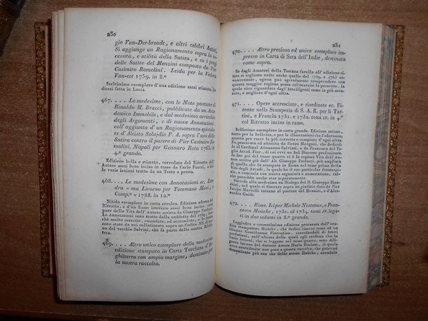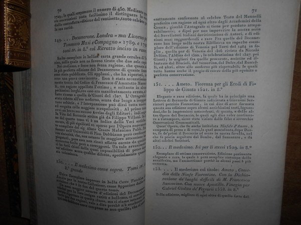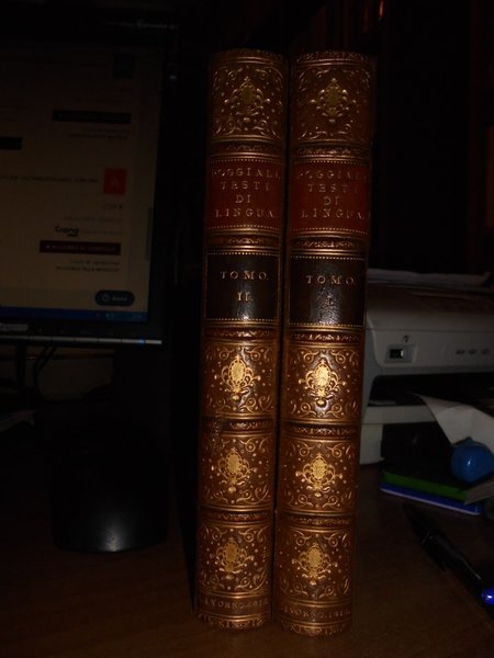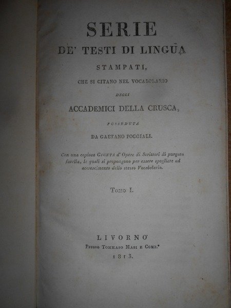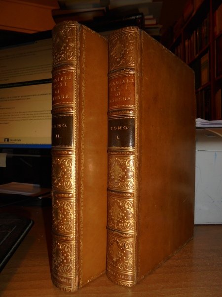 Gaetano, Poggiali. Livorno, Presso Tommaso Masi e Comp., 1813. Serie De' Testi di Lingua stampati che si citano nel vocabolario degli Accademici della Crusca. 2 tomi in-8°, bellissima legatura in piena pelle coeva, dorsi a 5 nervi con fregi floreali e titoli in oro, cornici in oro sui piani, tagli marmorizzati. VIII, 464 pp.; 392, XLIX, (3) pp. Grande collezionista, mise insieme una poderosa biblioteca nella quale spiccavano alcuni importantissimi manoscritti come il celebre codice Poggiali-Vernon ed in seguito Ginori Conti dal titolo “Commenti alla Commedia” che contiene innumerevoli e rarissimi commenti all’opera di Dante, coevi alla Divina Commedia. Bellissimo esemplare dell' edizione originale. Uff. F - 1