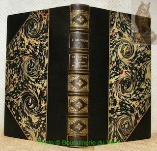 - reliure d’époque demi-chagrin à coins avec titre, auteur, filets, ornementations et fleurons dorés au dos à cinq nerfs. Trois filets dorés sur les deux plats. Plats et gardes papier marbré. Tranche supérieure dorée. Belle reliure. Très bel exemplaire tiré sur papier vélin, non justifié.
