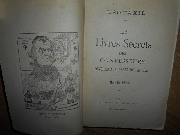 (Sesso in confessionale - Anticlericalismo massonico) LEO, Taxil (Gab. Jogand-Pagès). Paris, 1898. Les Livres secrets des confesseurs dévoilés aux père de famille. Nouvelle édition. In-8°, br. orig. con velina trasparente di protezione ed. ill. a col. con caricat., la stessa dell' antip. 213 pp. Cfr. Gay 898-9. Sapida opera del noto scrittore e contraffattore massone. In buono stato di conservazione. Neg. mens. bianca cassa scat. fiori