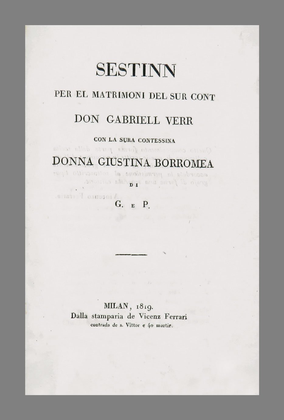 Sestinn per il Matrimoni del sur Cont Don Gabriell Verr con la sura Contessina Donna Giustina Borromea. G. e P.