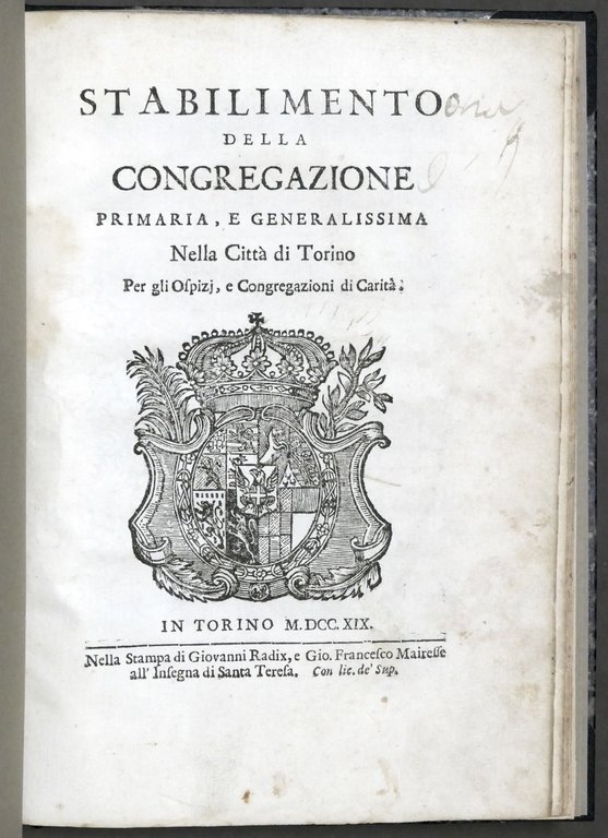 Settecentina - Stabilimento congregazione primaria città di Torino - 1^ ed. 1719