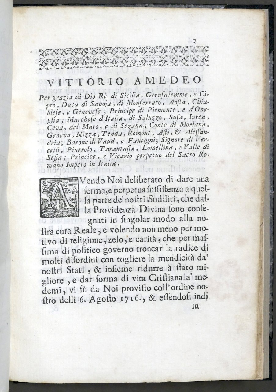Stabilimento della congregazione primaria, e generalissima nella città di Torino per gli ospizj, e congregazioni di carità In Torino, nella stampa di Giovanni Radix, e Gio. Francesco Mairesse all'insegna di Santa Teresa, 1719 Pag. 24 Stemma sabaudo di Vittorio Amedeo II sul frontespizio. Copertina rigida non coeva - Testo in italiano Buone condizioni. Piccoli segni del tempo. Legatura e sguardie rifatte.