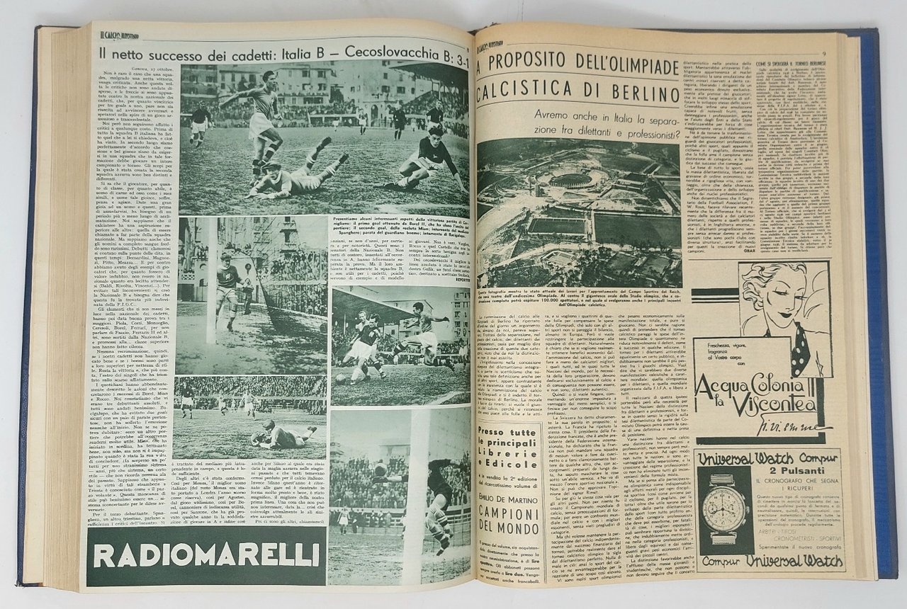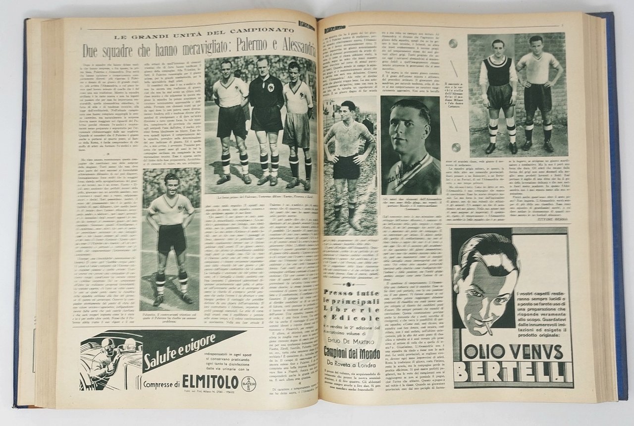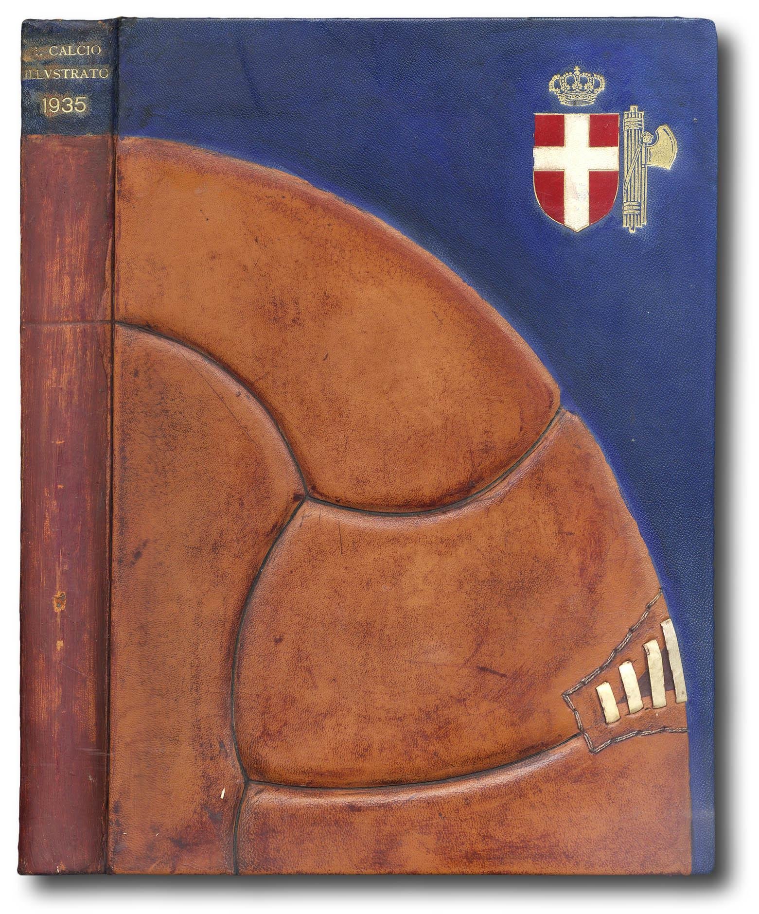 >51 fascicoli in un volume in-folio, con gran numero di illustrazioni. Annata completa. I fascicoli sono di 12 pagine cadauno, rilegati in un volume con straordinaria legatura in pelle blu, con grande intarsio sul primo piatto e al dorso in cuoio di tinta naturale, raffigurante porzione di pallone da calcio in rilievo, con cucitura mediante 4 strisce di pergamena; anche intarsiato è lo stemma sabaudo, sovrastato da corona ed affiancato dal fascio littorio, entrambi impressi in oro, come il titolo al dorso, tagli dorati, contropiatti e sguardie in seta blu. E' curioso notare che la stessa decorazione venne in seguito raffigurata sulla brossura dell' “Enciclopedia illustrata del calcio italiano” del 1939. Il primo numero del “Calcio illustrato” uscì il 2 dicembre 1931: fu l'editore Mario Vaccari a saper cogliere, in anticipo rispetto al resto della stampa, l'inarrestabile diffusione che il calcio stava vivendo in Italia. Fotografi e giornalisti, diretti da Leone Boccali, riuscirono a coprire in maniera approfondita tutta la Serie A e la B, la Coppe Europa e spesso anche “il calcio minore”. Autorevole settimanale sportivo, redatto da noti giornalisti, quali Ettore Berra, Raffaele de Luca, Renzo de Vecchi, Giovanni Telesio, Santo de Gaetano, Leo Cattini. Questa raccolta completa dell'annata successiva alla seconda vittoria italiana nella Coppa del Mondo costituisce un interessante documento storico per le cronache delle partite, l'apparato fotografico, gli aneddoti sui singoli personaggi, corredati di spiritose caricature, e le pubblicità di prodotti sportivi del tempo. Il settimanale è celebre anche per il gran numero di fotografie scattate durante le partite e costituisce dunque un prezioso cimelio non solo per gli appassionati di calcio, ma anche di fotografia. Esemplare in ottime condizioni. Importante volume in legatura veramente inusuale in stile fascista, di straordinaria provenienza con dedica autografa di Mussolini al celebre campione Raimundo Bibiani Orsi.