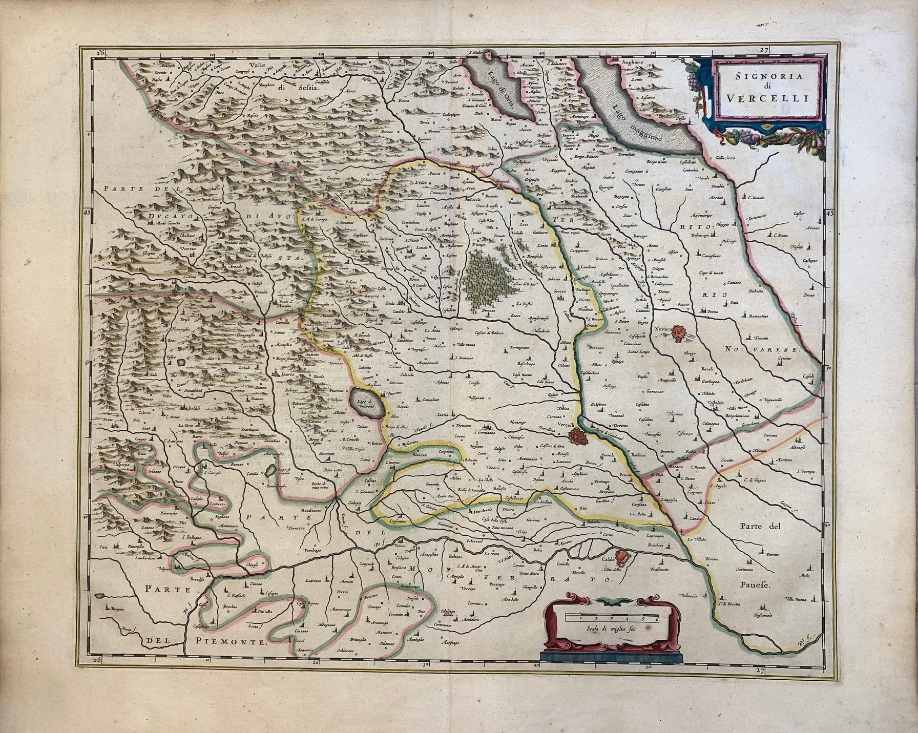 >Incisione in rame colorata da mano coeva (mm 410x500 ed ampi margini bianchi).Titolo in alto a destra entro cartiglio, in basso la scala miliare. Al verso il testo descrittivo in francese "Le Comté de Verceil". Dettagliata carta geografica raffigurante la parte orientale del Piemonte, dedicata in particolare alla zona relativa alla città di Vercelli ed a quella di Novara. Il distretto vercellese è confinante con il Monferrato, la Parte del Pavese , il Territorio Novarese , la Valle di Sesia, la parte del Ducato di Aosta , l'Abbazia di S.Maria di Lucedio. Nella tavola sono in evidenza i corsi d'acqua, la maggior parte dei centri abitati. Spicca la macchia verde del bosco a ovest di Rovasenda, tra Buronzo e Busonengo. Tavola tratta dal "Theatrum Orbis Terrarum sive Atlas Novus" edito da Joan Blaeu ad Amsterdam nel 1655. Si tratta del primo atlante veramente innovativo dopo quelli di Mercatore e Ortelio. Nell'edizione del 1655 in 6 volumi, quasi un intero volume è dedicato all'Italia. Le tavole che lo compongono si rifanno all'opera del Magini, l'Italia Nuova ( 1608 ). Il Magini fu il primo geografo-cartografo italiano a potersi servire largamente di fonti ufficiali. Sulla base di queste preziose carte, i Blaeu costruirono da veri artisti incisori le loro tavole ricchissime di particolari. Bel esemplare marginoso arricchito da bella coloritura coeva (piccolo strappo abilmente restaurato nel margine inferiore bianco).