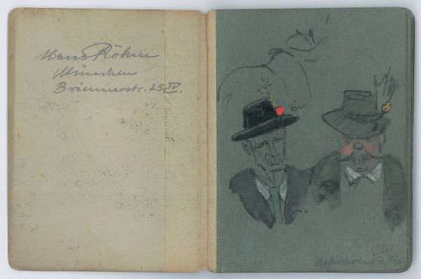 Small 8vo (143 x 110 mm). 32 ff. of sketches in coloured chalk pastels and charcoal on bluish-grey laid paper. Contemp. half cloth. Contains 19 pp. of sketches showing the Keferloh horse market (some dated September 14), the others mostly showing landscape views from the environs of Munich (captioned Herrsching, Großhesselohe, Grünwald, Solln, Karlsfeld, Allach etc.). Inside front cover has Röhm's autograph name and address in pencil. - The painter, etcher, and lithographer Röhm studied at Nuremberg and the Munich Academy (1898-1902) with Wilhelm von Diez war. In 1927 he became professor in Munich (cf. Thieme/Becker and Nürnberger Künstlerlexikon). - The Keferloh horse market (known as "Keferloher Montag") was the largest of its kind in the German Reich until the Second World War. - Binding somewhat stained and rubbed; interior very well preserved.