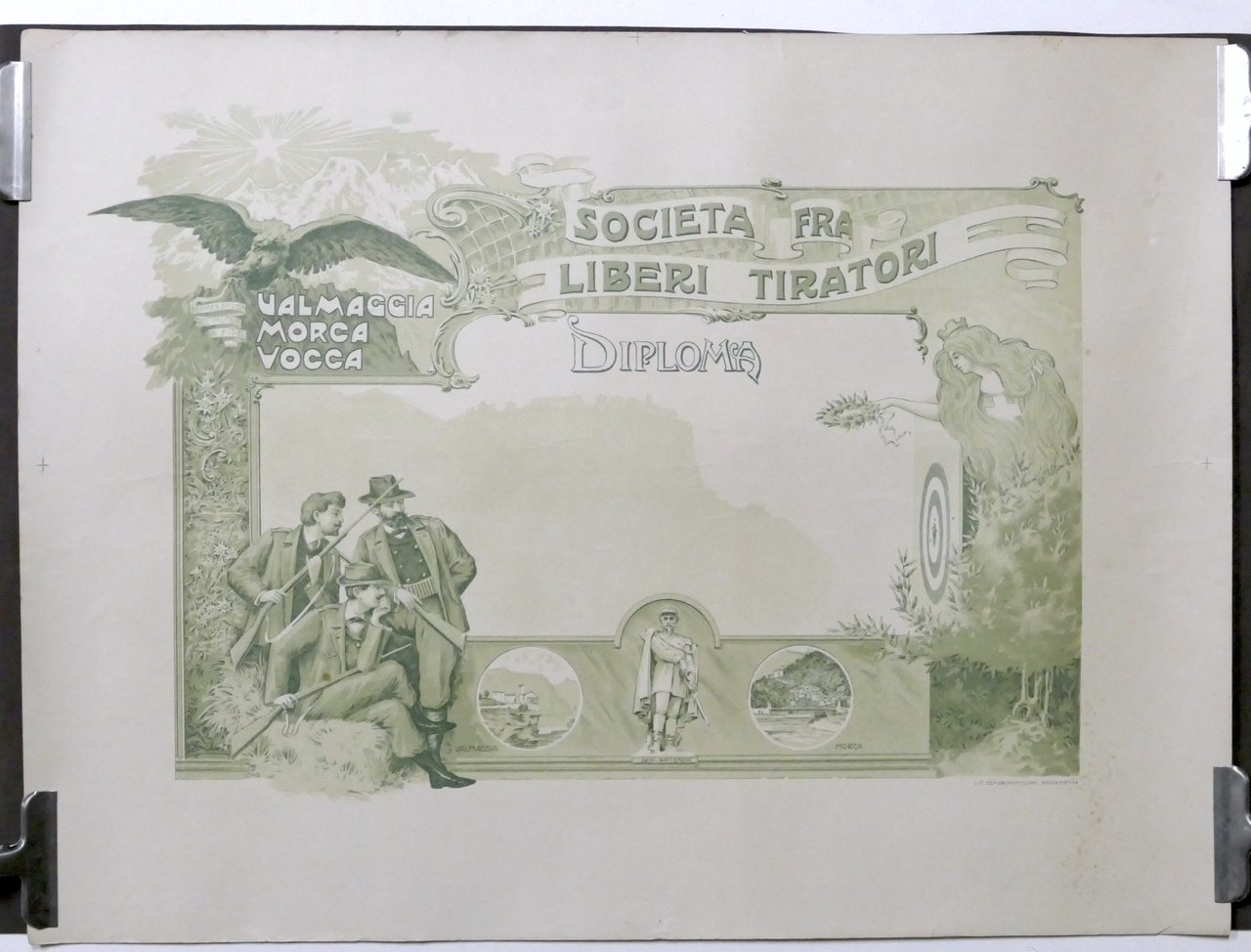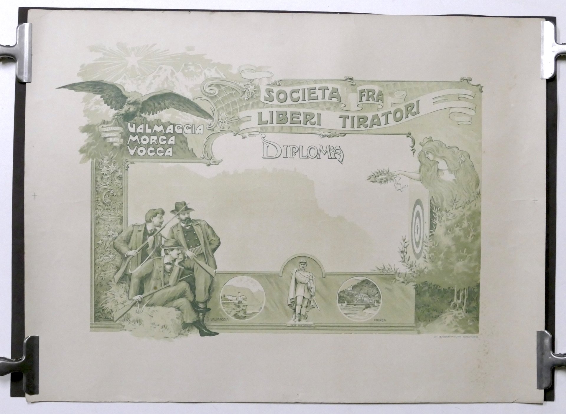 Società fra Liberi Tiratori - Valmaggia, Morca, Vocca - Diploma in bianco fine '800 Dimensioni: 50 x 67 cm ca. Condizioni molto buone. Piccoli tagli ai bordi.