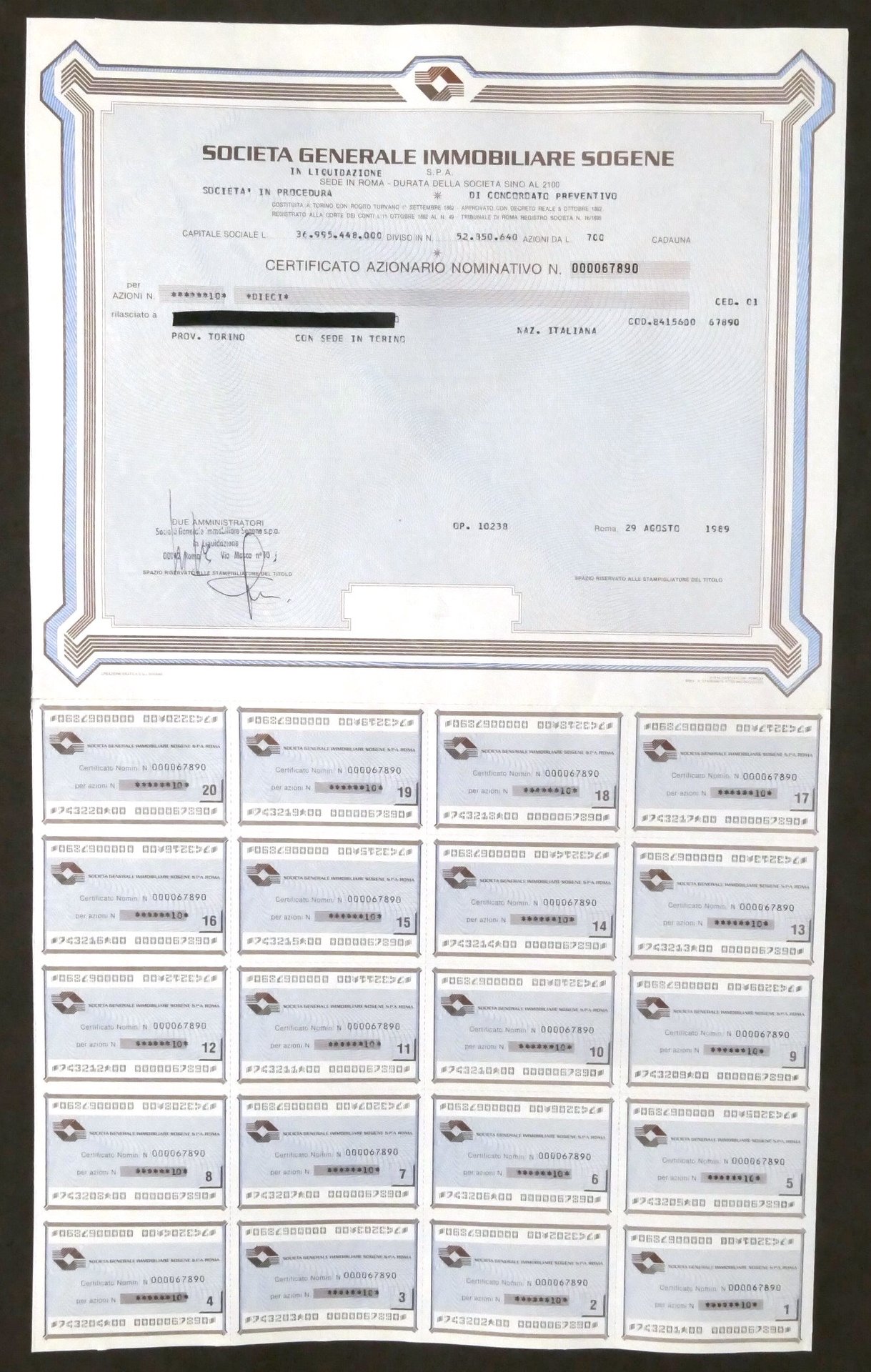 Società Immobiliare Sogene - Certificato azionario - Dieci azioni - 1989
