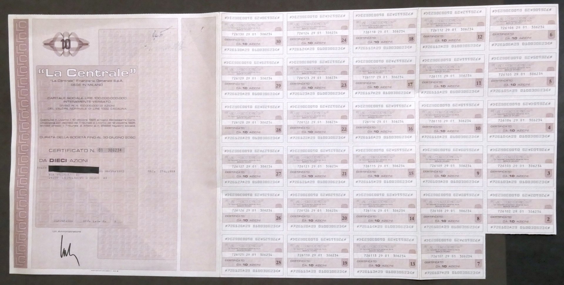 Società La Centrale - Milano - Certificato azionario - Dieci azioni - 1981 Con cedole come da foto. Condizioni generali molto buone.
