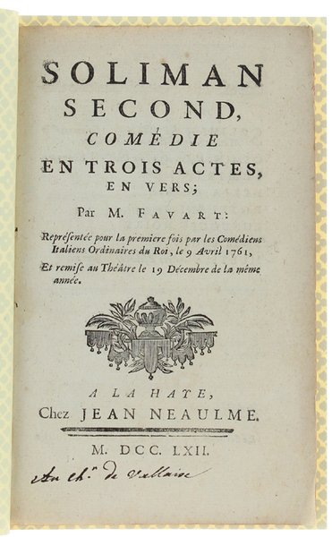 SOLIMAN SECOND, Comédie en trois actes, en vers. Représenté, pour la Premiere Fois, par les Comédiens Italiensis Ordinaires du Roi, le 9 Avril 1761…